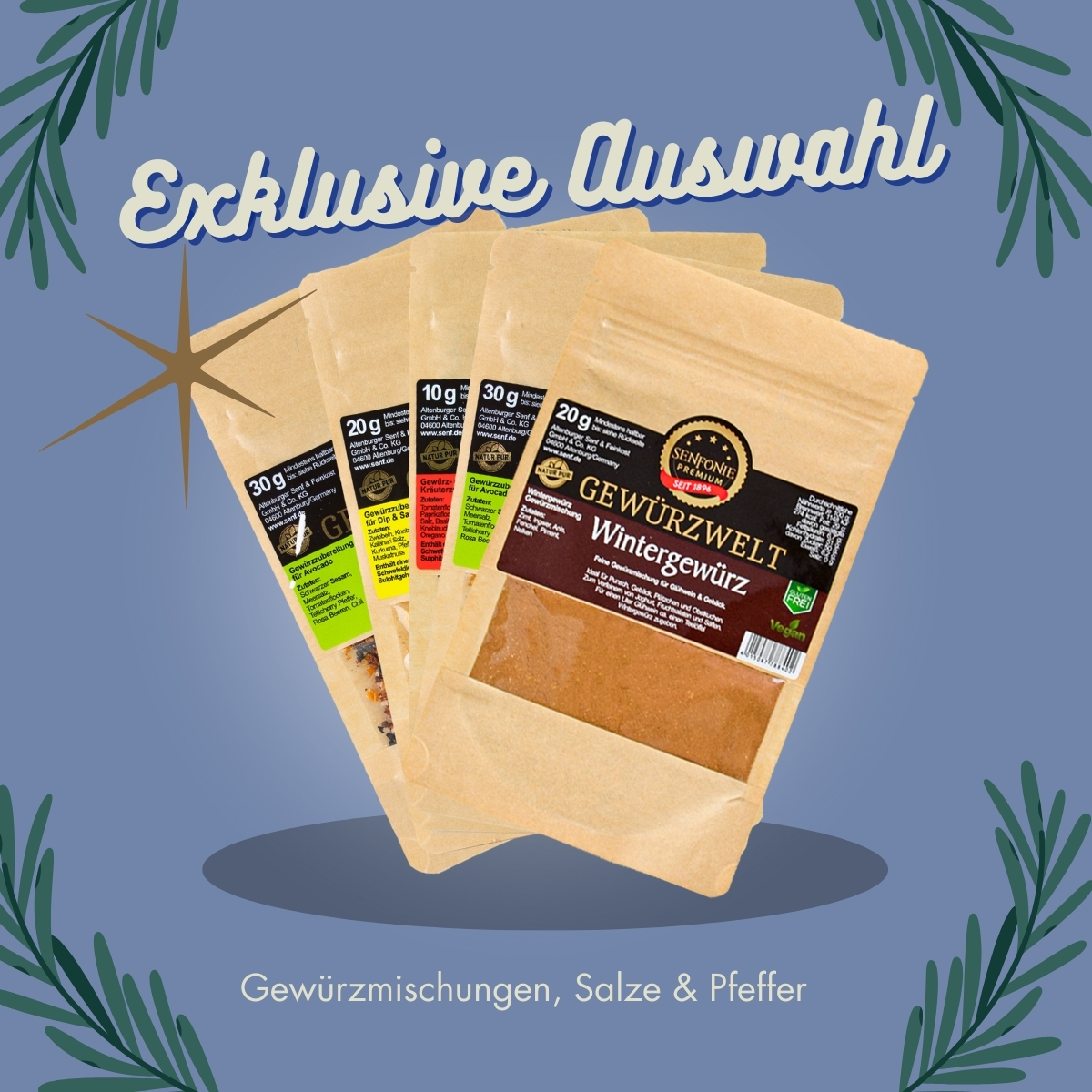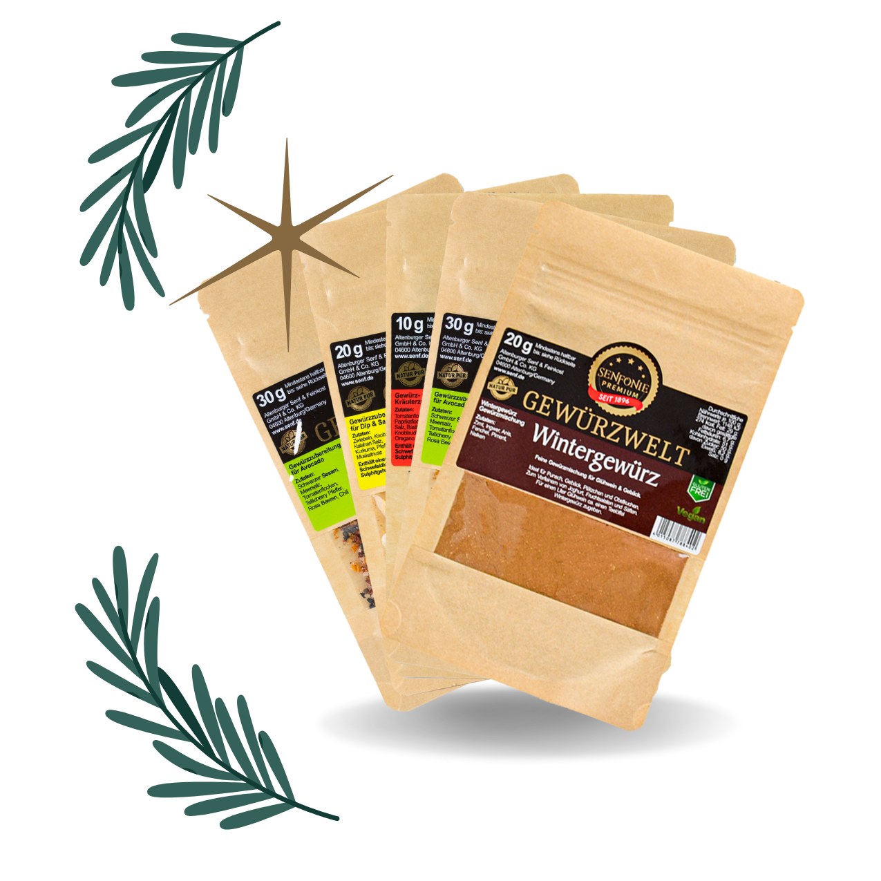 Wintergewürz - Gewürzmischung (20g); Zutaten: Zimt, Ingwer, Anis, Fenchel, Piment, Nelken; Nährwerte*: Brennwert:1148kJ/274kcal; Fett:29g; davon gesättigte Fettsäuren:6,7g; Kohlenhydrate:51g; davon Zucker:50g; Eiweiß:8,2g; Salz:0g