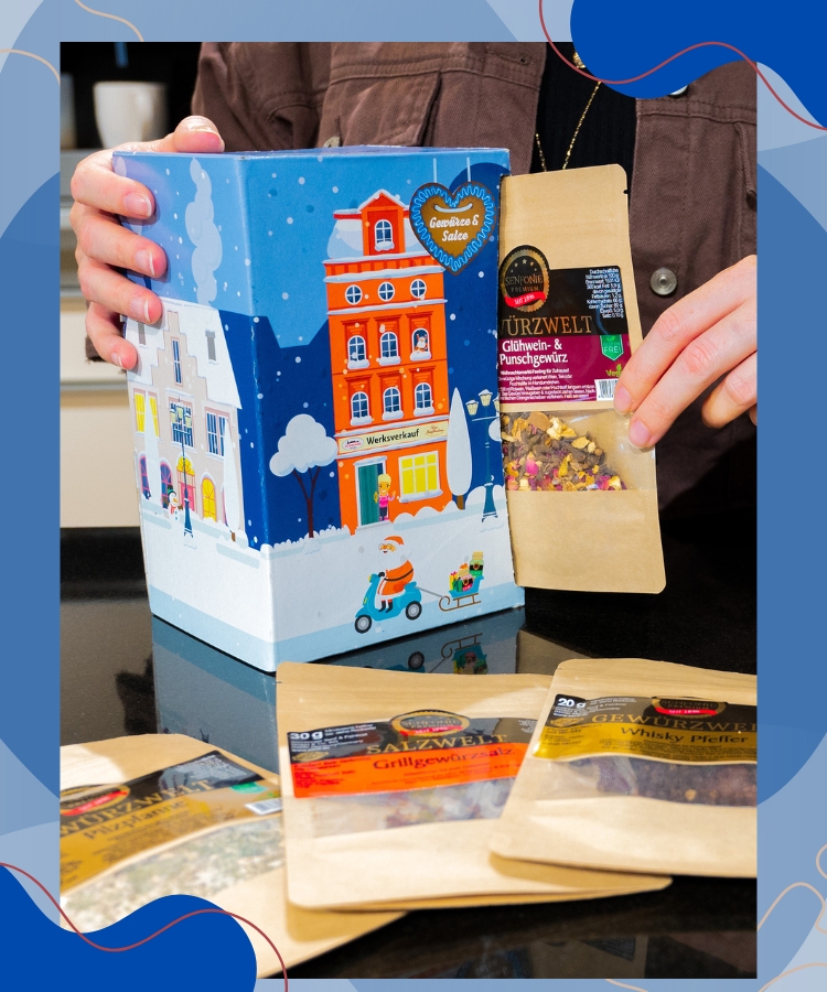 Wildgewürz (15g); Zutaten: Grüner Pfeffer, Wacholderbeeren, Orangenschale, Muskatblüte, Zitronenschale, schwarzer Pfeffer, Thymian, Rosmarin, Piment, Lorbeerblätter; Nährwerte*: Brennwert:1183 kJ/283kcal; Fett:8,2g; davon gesättigte Fettsäuren:4,1g; Kohlenhydrate:42,9g; davon Zucker: 22g; Eiweiß:8,3g; Salz:0g