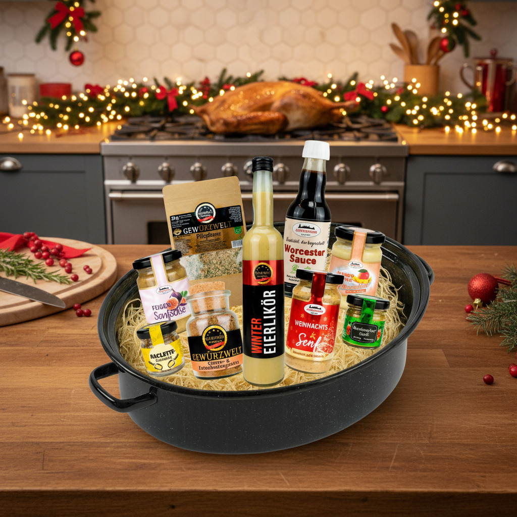 Der Weihnachts-Edition Bräter vereint alles, was wir an der festlichen Jahreszeit lieben: Wärme, Genuss, Handwerk & kleine Überraschungsmomente. Unser traditioneller Emaille-Bräter passt wie geschaffen für Genießer, die Wert auf Qualität und Natürlichkeit legen. Gefüllt mit handgemachten Spezialitäten, winterlichen Gewürzen und feinen Saucen ist dieses Geschenk ein echtes Highlight unter jedem Weihnachtsbaum. Ein Fest für alle Sinne – und eine Geschenkidee, die zeigt, wie viel Liebe in guten Produkten steckt.