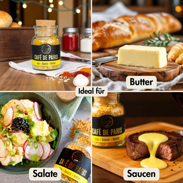 Entdecke den vielseitigen Kick von Café de Paris - mehr als nur eine Sauce! Diese pikante Gewürzmischung verleiht deinem Frühstücksrührei und Gemüsesuppen wie Kürbis, Spargel oder Blumenkohl eine raffinierte Note. Oder wie wäre es mit einem deftigen Eintopf, der mit diesem Feinschmecker-Gewürz zum kulinarischen Highlight wird? Verleihe deiner Butter eine feine Würze oder peppe Geflügelsalate auf. Gib einfach ein paar Esslöffel in Gratins, Sahnesaucen oder in deine Grillmarinaden für einen echten Geschmackskick! Unser Tipp: Kreiere einen frischen Dip für Gemüse und Fleisch, indem du 100g Joghurt, 100g Crème Fraîche, 2 TL Café de Paris und eine Prise Salz vermischst - einfach köstlich! Lass deine Geschmacksknospen mit Café de Paris tanzen und entdecke die unendlichen Möglichkeiten dieser pikanten Gewürzmischung!