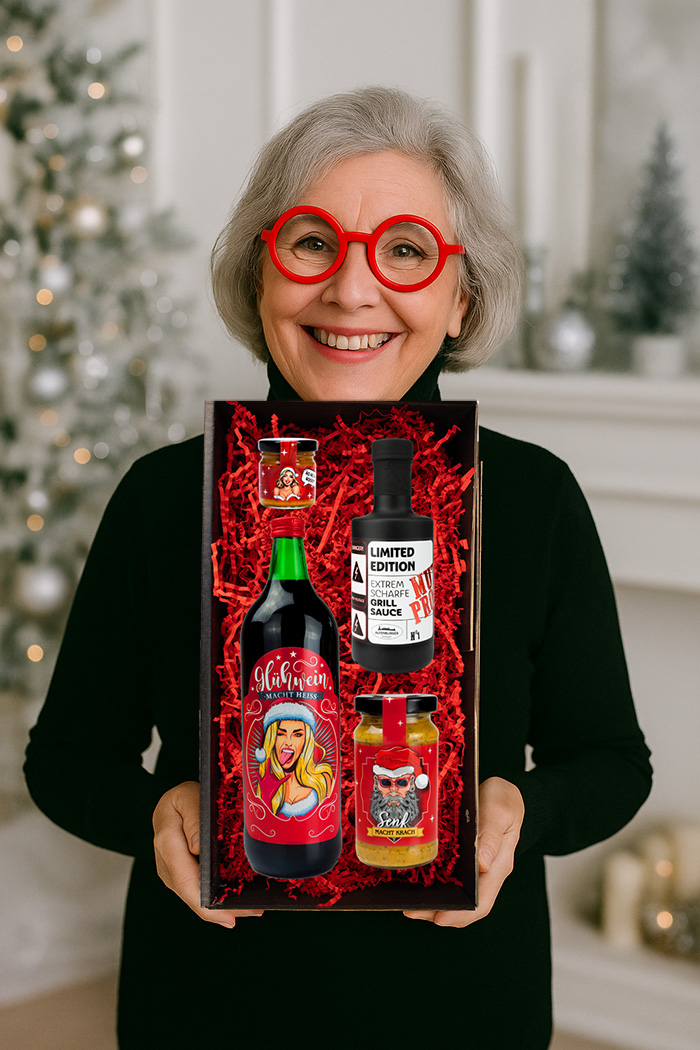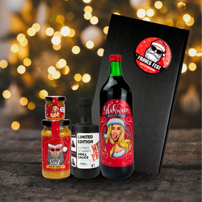 Das Highlight dieser Box ist unser "Glühwein, der macht heiß". Dieser köstliche Glühwein bringt Wärme und Gemütlichkeit in die Festtage. Perfekt, um sich an kalten Abenden aufzuwärmen und den festlichen Spirit zu spüren. Für die Abenteurer unter uns haben wir die "Mutprobe" Grillsauce. Sie verbindet angenehme Schärfe mit einer explosionsartigen Geschmacksvielfalt und verleiht deinen Gerichten einen gewagten Kick. Ideal für gegrilltes Fleisch und mehr. Unser knackiger Weihnachtssenf ist die ideale Ergänzung zu deiner festlichen Tafel. Mit einer ausgewogenen Mischung aus süß und scharf gibt er deinen Mahlzeiten das gewisse Etwas und rundet den Genuss perfekt ab. Aber das ist noch nicht alles!