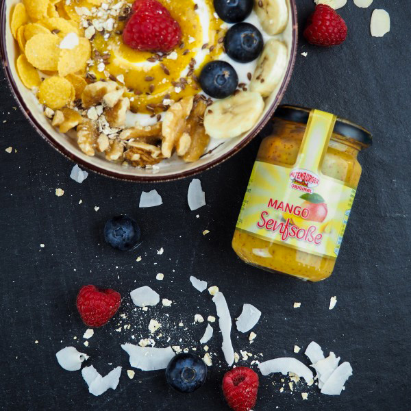 Herrlich fruchtige Mango Senfsoße aus 50 % hausgemachter Konfitüre von sonnengereiften Mangos ist wunderbar zum Dippen, Abschmecken, Marinieren und Kochen geeignet. 50 % frisch geschroteter Senf runden die spritzig-süße Note mit einer feinen Portion Schärfe ab. Unsere Mango Senfsoße passt hervorragend zu Hartkäse, Schnitte- und Weichkäse, als fruchtige Komponente zu herzhaftem Fleisch oder zur Verfeinerung von Frühstückbowls, Obst- und Gemüsesalaten.