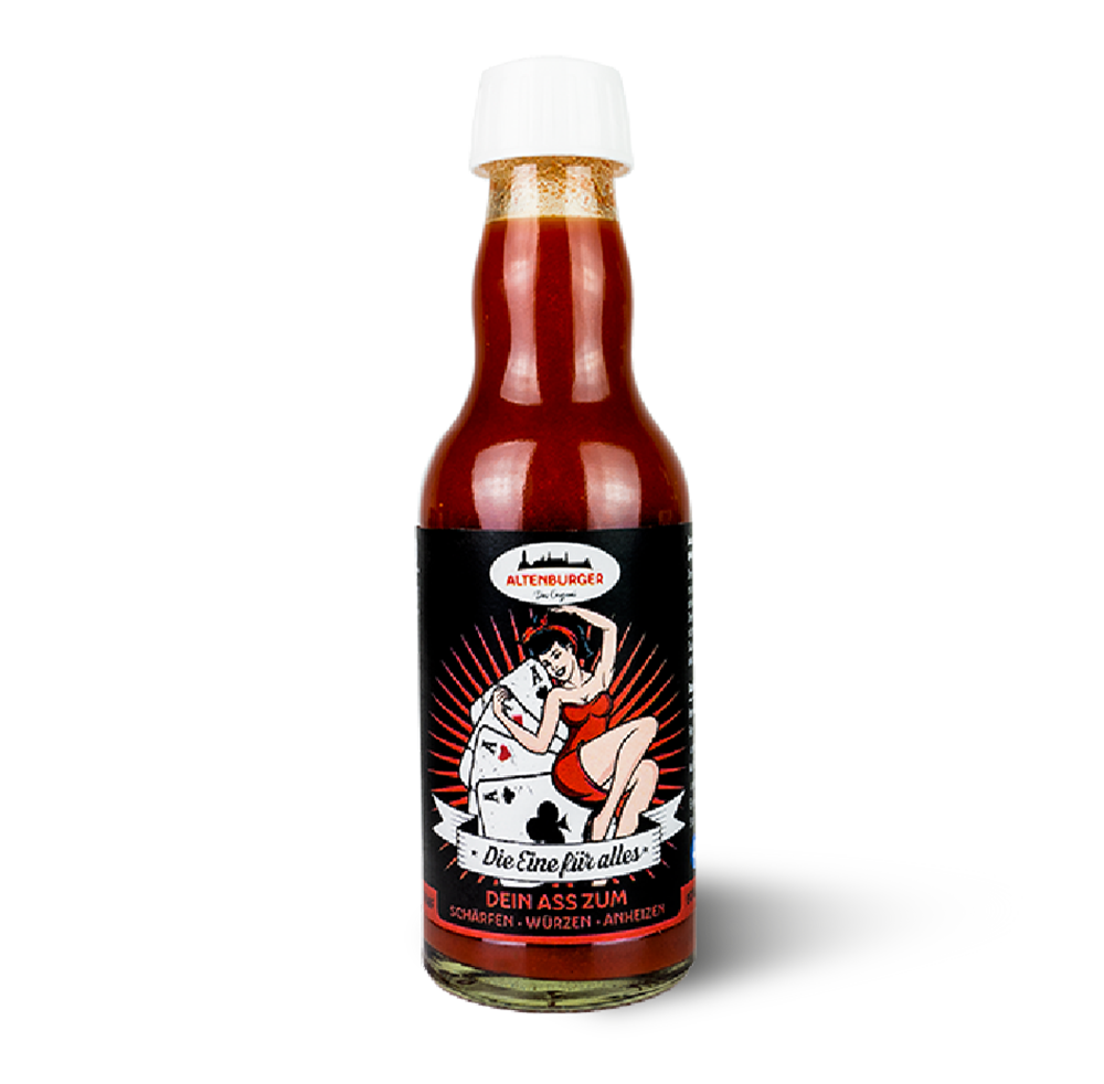 Deine Scharfe Chili Soße zum deftigen Schärfen von Saucen, Dips, Fleisch und Marinade. Die Eine Scharfe für Alles hat richtig Feuer und heizt deinen Speisen so richtig ein - Achtung: FEURIG SCHARF! Eine extra Portion Chili und das beste aus sonnengereiften Tomaten machen die Sauce zu etwas ganz besonderem. Anfangs noch fruchtig pikant, steigt dir das Feuer bis zu den Ohren! Sei mutig und probier´ sie.