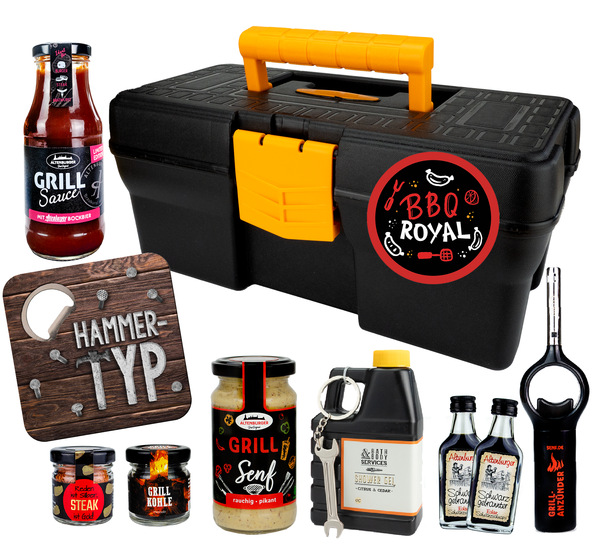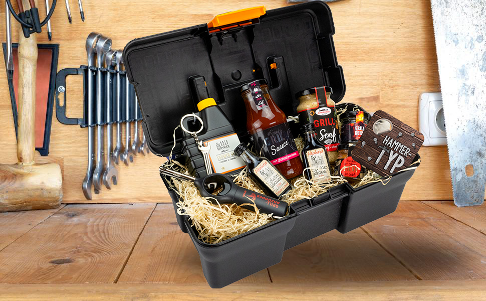 Entdecke den ultimativen Werkzeugkoffer mit einem Hauch von Raffinesse - perfekt für dich, den DIY-Enthusiasten und Hobbyhandwerker! Diese originelle Geschenkidee ist nicht nur praktisch, sondern auch stilvoll und ansprechend für deine Freunde und Familie. Verfeinere deine kulinarischen Kreationen mit hochwertigem Senf, Grillsauce und Salz. Genieße die aromatische Frische mit unserer einzigartigen Handseife in Kanisterform, komplett mit einem charmanten Anhänger. Entzünde deine Grillpartys mit Leichtigkeit dank des praktischen "Grillanzünders". Lustiger Untersetzer "Hammertyp" mit integriertem Flaschenöffner ist die perfekte Mischung aus Humor, Funktionalität und Stil.
