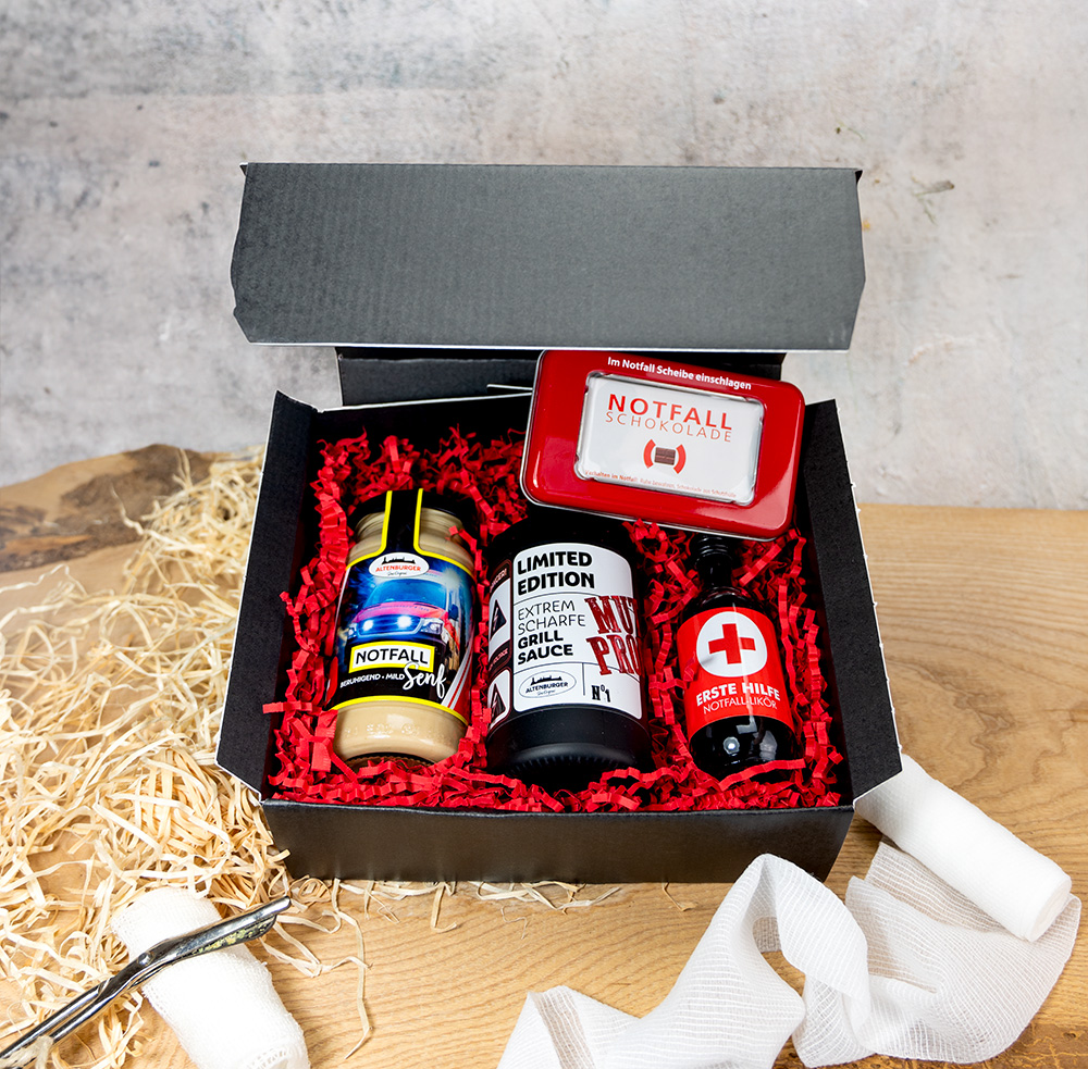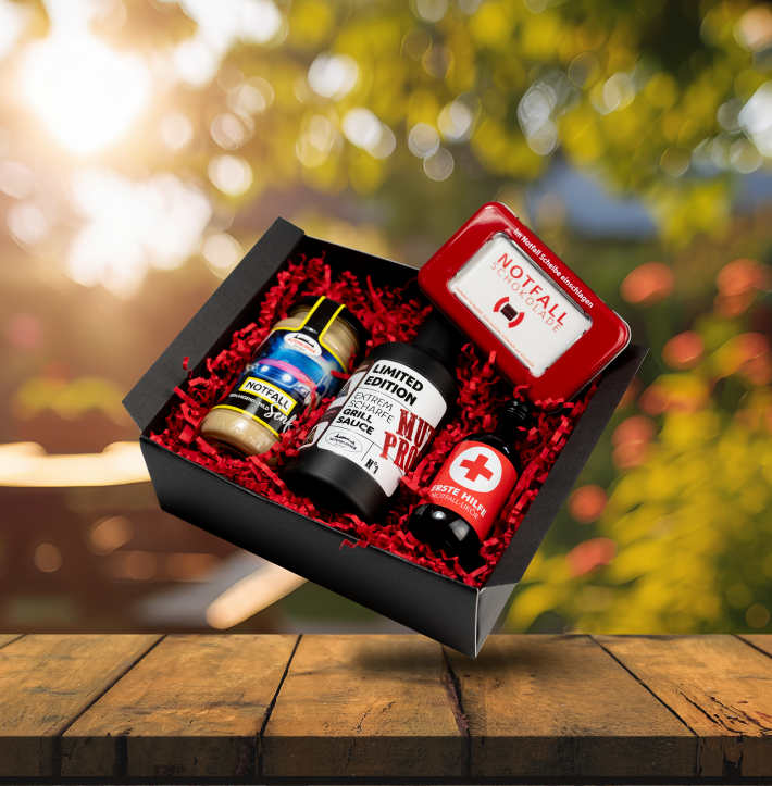 Bereit für eine kulinarische Rettungsmission? Die "Erste Hilfe" Box ist genau das Richtige, wenn der Hunger oder die Geschmacksknospen nach Hilfe rufen! Erstmal schnappst du dir die Notfall-Schokolade - der ultimative Trostspender für alle Naschkatzen in Notlagen. Dann kommt die Grillsauce "Mutprobe" ins Spiel - für die wahren Helden am Grill, die keine Angst vor Feuer haben. Aber Moment mal, was ist das? Der Kräuterlikör "Erste Hilfe"! Ein Schluck davon und du fühlst dich gleich wieder gestärkt. Und last but not least: unser Notfall-Senf - für alle, die gerne scharf durch's Leben gehen.