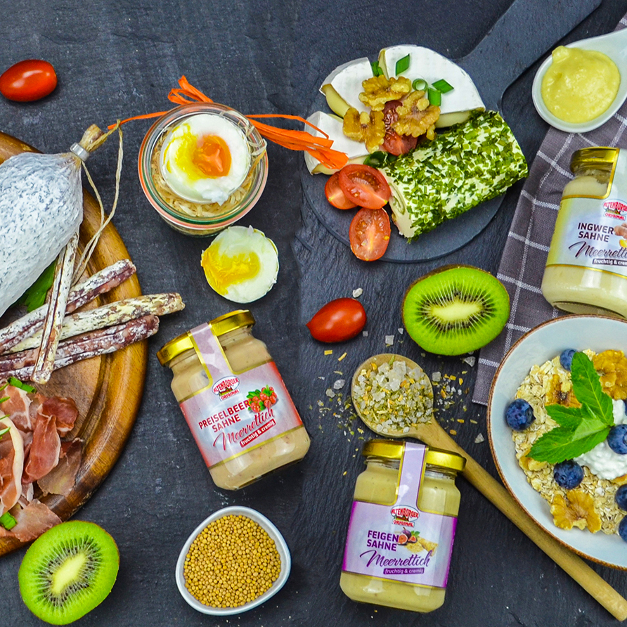 Tauche ein in ein Geschmacksabenteuer mit unserem super leckeren Feigen Sahne Meerrettich! Die perfekte Kombination aus scharfem Meerrettich, cremiger Sahne und fruchtigen Feigen lässt deine Geschmacksknospen tanzen. Ideal zum Tafelspitz, auf Käse, geräuchertem Lachs und Schinken. Dieser einzigartige Genuss verleiht jedem Gericht das gewisse Etwas und lässt dich nach mehr verlangen!