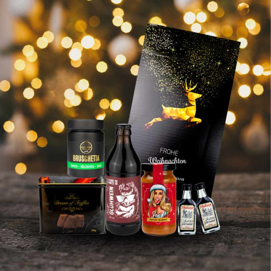 Unser kreatives "Weihnachtsfeier" Geschenk bringt alle Zutaten für eine gelungene Feier direkt nach Hause! Gefüllt mit wärmendem Glühwein, würzigem Senf, einem aromatischen Gewürz und einem feinen Schnaps, bietet dieses Set alles, was man für die festliche Jahreszeit braucht. Dazu gibt's eine stilvolle Postkarte "Frohe Weihnachten" für deine persönlichen Grüße. Perfekt als Geschenk für Freunde, Familie oder Kollegen – für ein Fest voller Geschmack und Freude!
