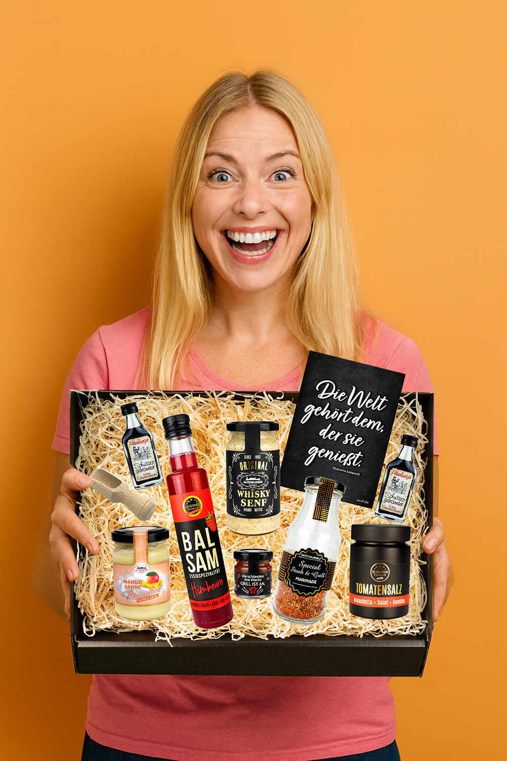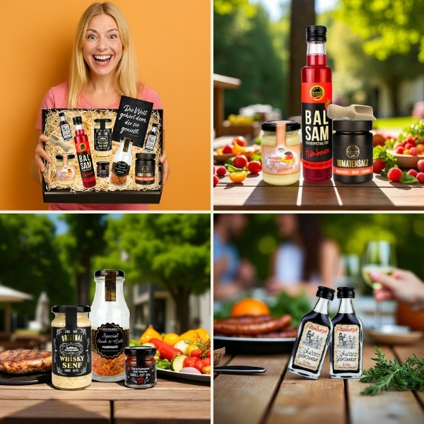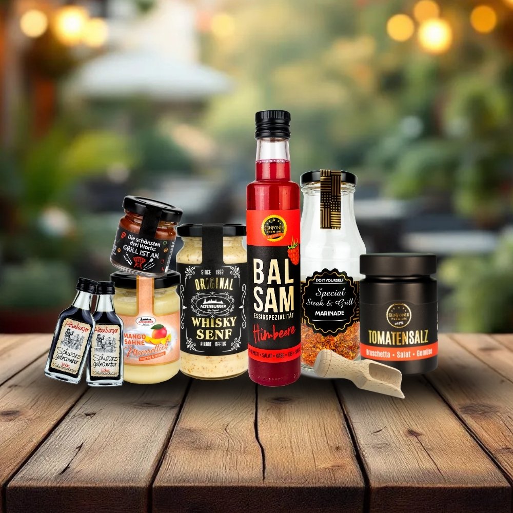 Verschenke kulinarische Leckereien aus Altenburg und bereite eine Freude mit regionalen Köstlichkeiten! Ob Senf, Gewürze, Meerrettich, Sauce oder Schnaps – jeder Präsentkorb ist liebevoll verpackt und enthält eine Postkarte mit dem Spruch "Die Welt gehört dem, der sie genießt." Ein Sticker "Geschenk voller Genuss" macht das Präsent perfekt. *Hinweis: Die Sorte des Fruchtessigs kann variieren. Entdecke die perfekte Geschenkidee, die Gaumenfreuden und herzliche Botschaften vereint!