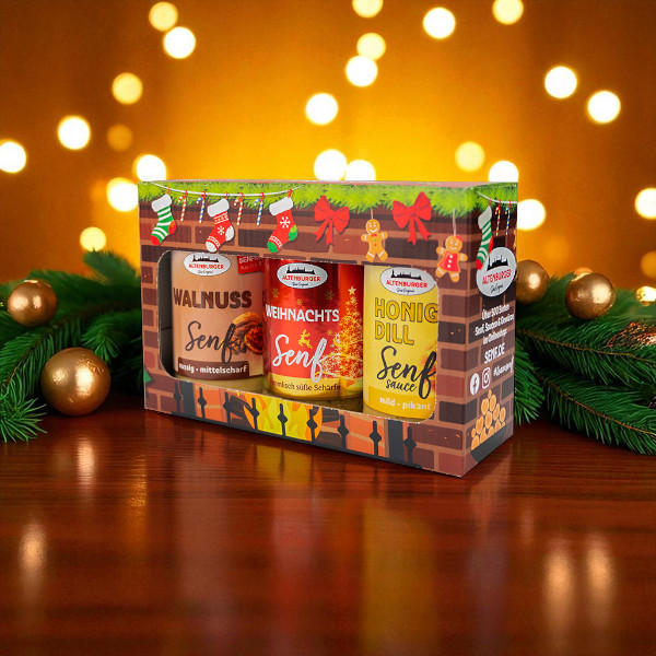 Unsere Klassische Weihnachtskiste im romantischen Kamin-Design ist das perfekte Geschenk für Senfliebhaber in der Advents- und Weihnachtszeit! Diese liebevoll gestaltete Kiste im nostalgischen Kamin-Look enthält eine exquisite Auswahl an erlesenen Senfsorten, die jede Festtafel verfeinern. Ob zum Verfeinern von Festtagsgerichten oder als stilvolles Highlight unter dem Weihnachtsbaum – mit dieser Kiste schenken Sie nicht nur Geschmack, sondern auch ein Stück winterliche Gemütlichkeit. Ein ideales Geschenk, das Herzen und Gaumen gleichermaßen erfreut!