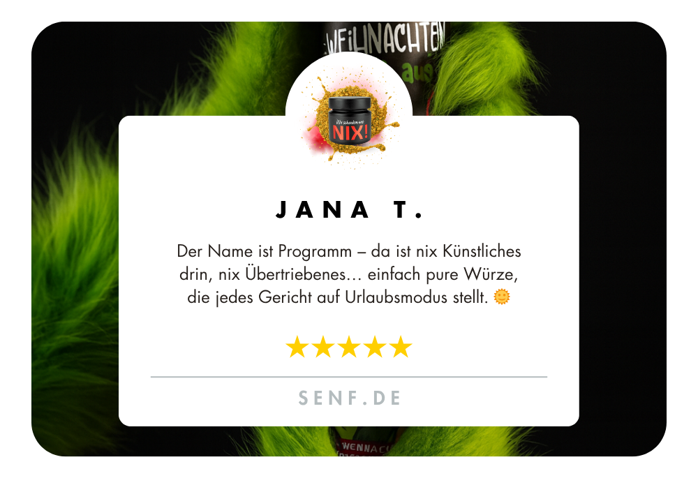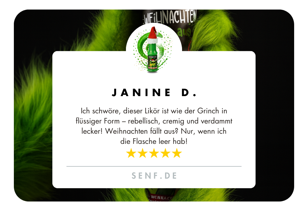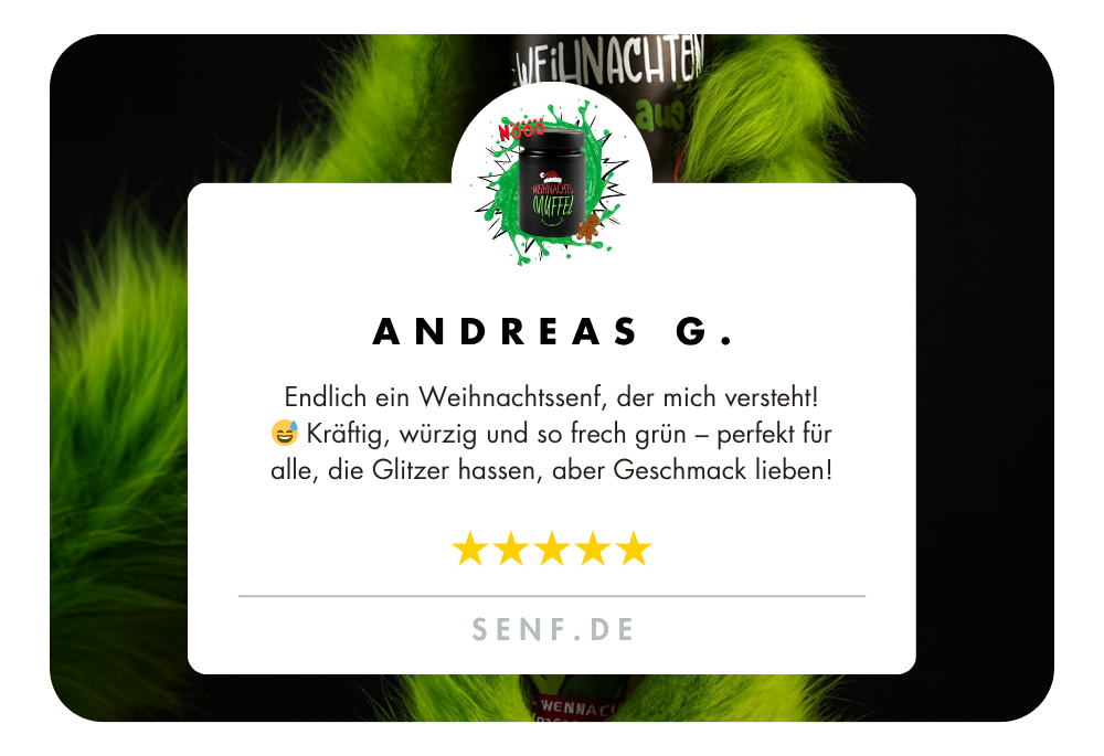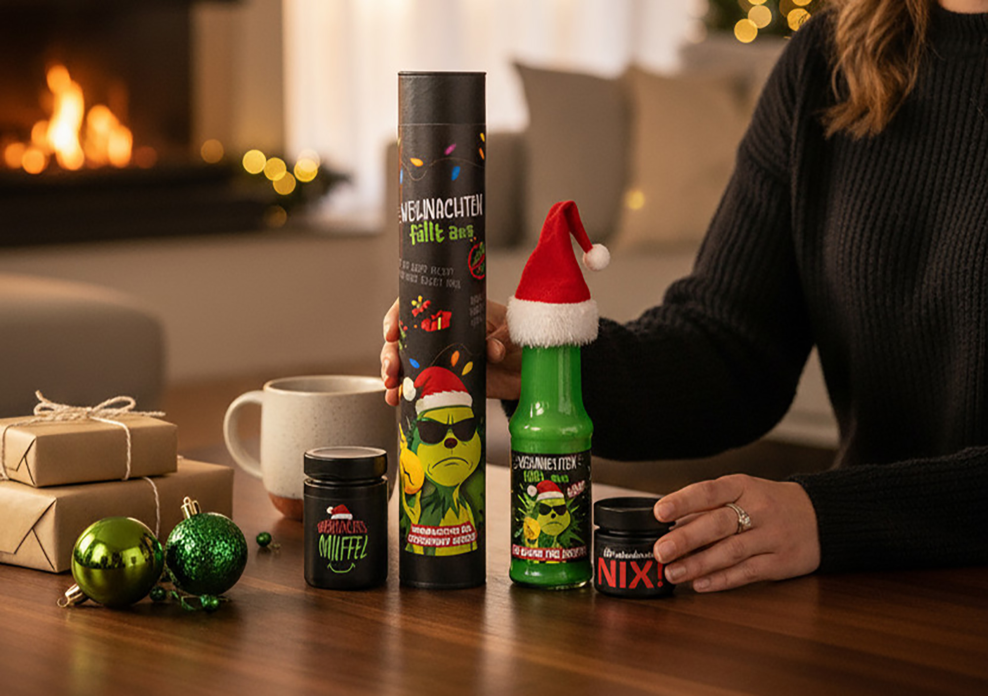 Na toll, schon wieder Weihnachten – überall Lametta und gute Laune. Zum Glück hab ich die Geschenkrolle „Weihnachten fällt aus“ gefunden: kräftiger Weihnachtsmuffel Senf, das ehrliche NIX Gewürz und ein grün-frecher Saurer-Apfel-Likör, der selbst mir schmeckt. Alles handgemacht, natürlich und im Glas – ganz ohne Festtagskitsch. Perfekt zum Verschenken oder, besser noch, zum Selbstbehalten. Weihnachten fällt aus – aber schmeckt überraschend gut! 💚 - Der Grinch höchstpersönlich