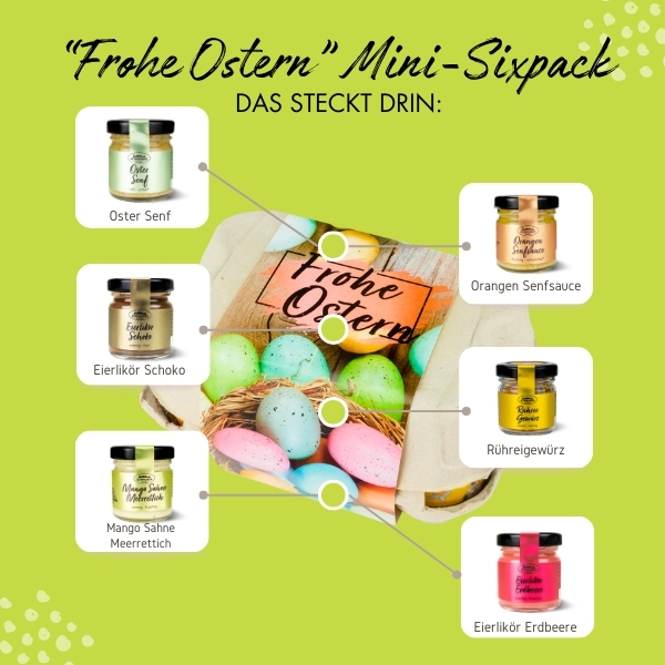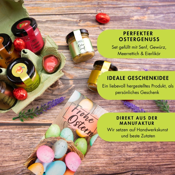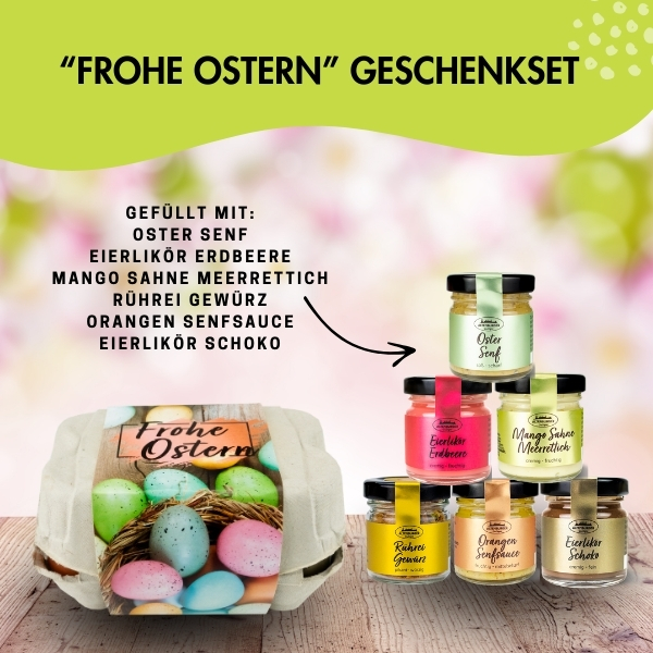 Mit der „Frohe Ostern“ Eierschachtel bringst du Abwechslung und Genuss auf den Ostertisch! Dieses Set vereint sechs handgefertigte Spezialitäten, die mit Liebe und ohne Zusatzstoffe hergestellt wurden. Von süß-scharfem Oster Senf über fruchtig-frische Orangen Senfsoße bis hin zu cremigem Eierlikör – jede Sorte verleiht deinen Ostergerichten das gewisse Etwas. Das Rühreigewürz sorgt für den perfekten Start in den Tag, während der Mango Sahne Meerrettich und die Senfsoßen Fleisch- und Käsegerichte auf ein neues Level heben. Ob als originelles Geschenk oder für den eigenen Genuss: Mit diesem Set bist du bestens für den Frühling gewappnet. Entdecke Qualität, Regionalität und Nachhaltigkeit in einem charmanten Osterdesign – für Genuss, der bleibt! 🐰🌸🍳