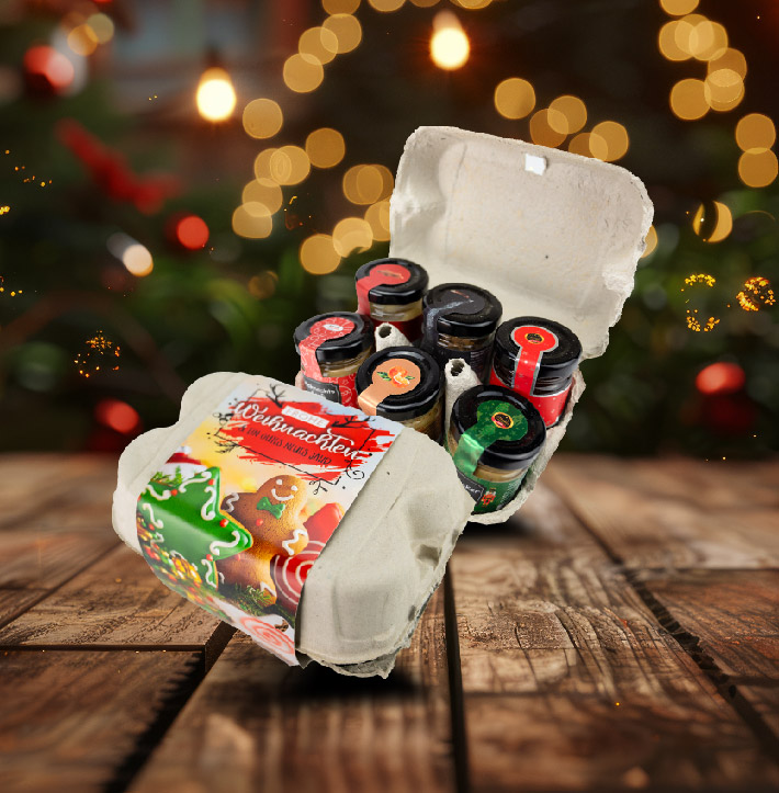 Schenken macht Freude – und mit unserem "Frohe Weihnachten" Geschenkset wird jede Geschmacksknospe zum Fest! In sechs handverlesenen Mini-Gläsern steckt pure Genussvielfalt: von fruchtig über würzig bis hin zu süß-scharf. Perfekt zum Probieren, Teilen oder Verwöhnen – für dich selbst oder als liebevolle Überraschung für andere. Ob für Gourmets, Feinschmecker oder einfach alle, die das Besondere lieben – dieses Set bringt den Weihnachtszauber direkt auf den Tisch. Ein Geschenk, das nicht nur Augen leuchten, sondern Herzen höher schlagen lässt!