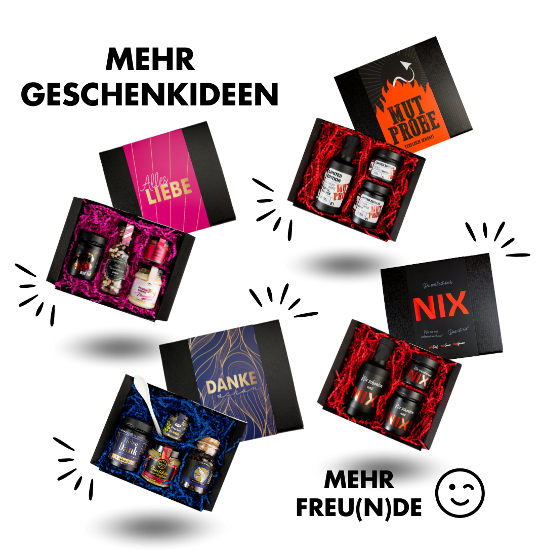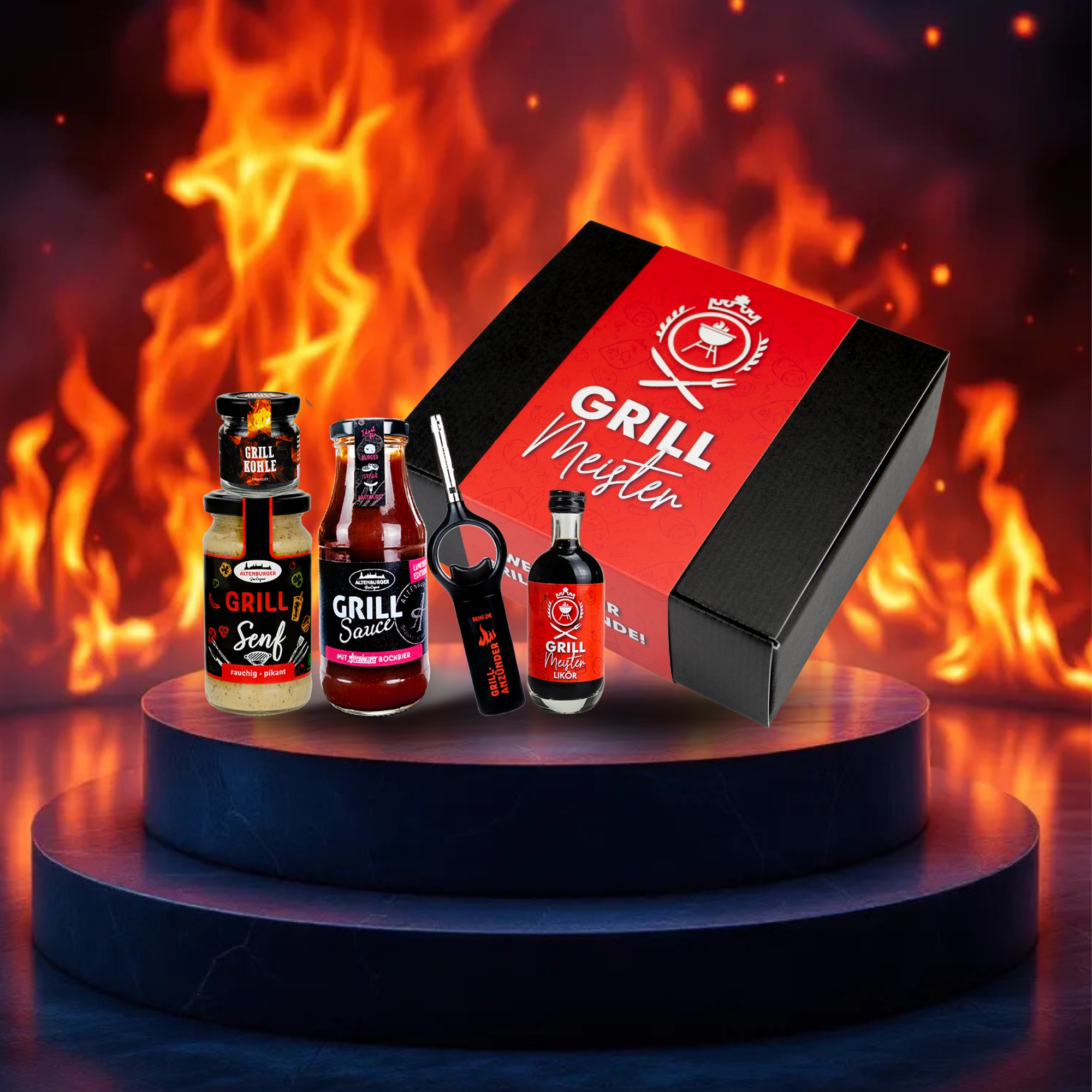 In dieser coolen Geschenkbox steckt alles, was du für den perfekten Grillabend brauchst. Wir haben für dich die originelle "Grillkohle" und das passende Feuerzeug, damit das Feuer so richtig lodert. Dazu gibt's unsere Grillsauce mit Altenburger Bockbier für den extra Kick, dazu noch unseren rauchigen Grill-Senf, der jedem Steak das gewisse Etwas verleiht. Und wenn du dann den perfekten Abschluss willst, gönn dir einen Schluck unseres Kräuterlikörs. Damit wird dein Grillabend einfach unvergesslich!