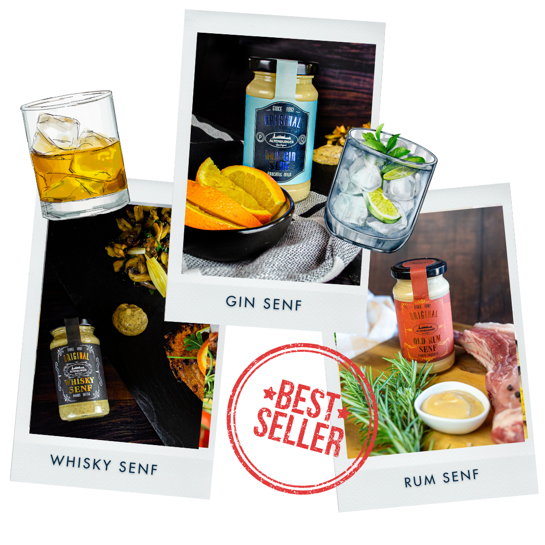 Grandios, grober Whisky Senf: Senf trifft auf Whisky. Dieser vollmundige grobe, mittelscharfe Senf entfaltet seine ausgewogene, würzige Note durch Blended Whisky! Whisky Senf ist ein Allrounder unter den Senf-Sorten und schmeckt hervorragend zu allen Fleischgerichten, in Salatdressings oder zur Verfeinerung von Dips und Saucen. Das perfekte Geschenk für Liebhaber von feinen Spirituosen. Im Altenburger Rum Senf verschmelzen mittelscharfer Senf, würziges Bratapfel-Chutney und wärmender Rum zu einem vollen, runden und perfekten Ganzen. Eine charakteristische Bratapfelsüße wird gefolgt von Zimt und Anklängen von Ingwer sowie die leichte Senf-Schärfe. 5 % von im Holzfass-gereiftem Rum sorgen für das besondere Finish. So wird der Old Rum Senf zu einem schmackhaften Begleiter zu Wild- und Bratengerichten. Die erlesenen Zutaten machen den fruchtig, milden Gin Senf zu einem Gaumenschmaus.Die perfekte Balance zwischen Senf & Gin. Die fein-herbe Süße von fruchtiger Orange und Gin bringen diesen mittelscharfen Senf in idealen Einklang. Hergestellt nach geheimer Familienrezeptur und tiefer Liebe zu Senf! Dry Gin Senf passt perfekt zu warmen- und kaltem Geflügel, Käsespezialitäten oder zur Herstellung feiner Salatsaucen.