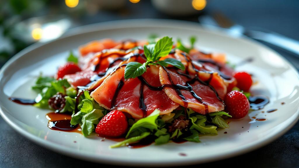 Eine einfache und raffinierte Idee ist ein sommerlicher Salat mit frischen Erdbeeren, Rucola, Ziegenkäse und knusprigen Walnüssen. Die Erdbeeren harmonieren perfekt mit einer süß-säuerlichen Balsamico-Crema, die du großzügig über den Salat träufelst. Für das gewisse Extra kannst du noch ein paar Blätter frischen Basilikum hinzufügen. Die Kombination aus der Cremigkeit des Käses, der Frische der Erdbeeren und dem nussigen Crunch sorgt für einen aufregenden Geschmacksmix, der durch die Balsamico-Crema abgerundet wird. Perfekt als Vorspeise oder leichtes Sommergericht!