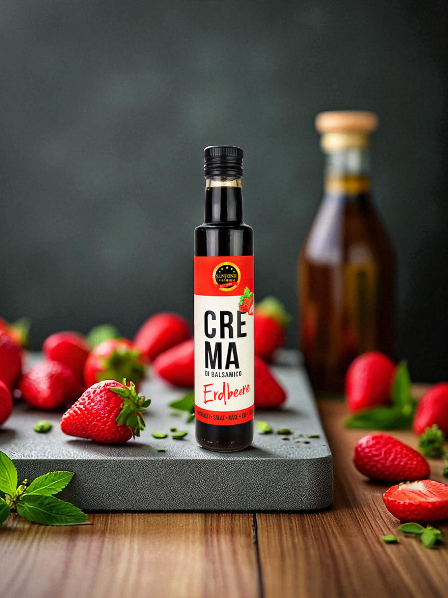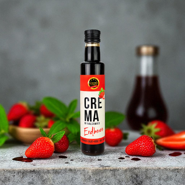Zur Verfeinerung von gebratenem Fleisch wie Steaks oder Wildsaucen, zu gegrillten Fisch ein Genuss oder zu Süßspeisen wie Panna Cotta, Joghurt und Eis. Unsere Balsamico Crema Erdbeere schmeckt sehr weich, cremig, fruchtig mit typisch würziger Balsamico Note. Mit unseren Cremas kannst du Sommeurlaub-Feeling zaubern. Ein freches Früchtchen!