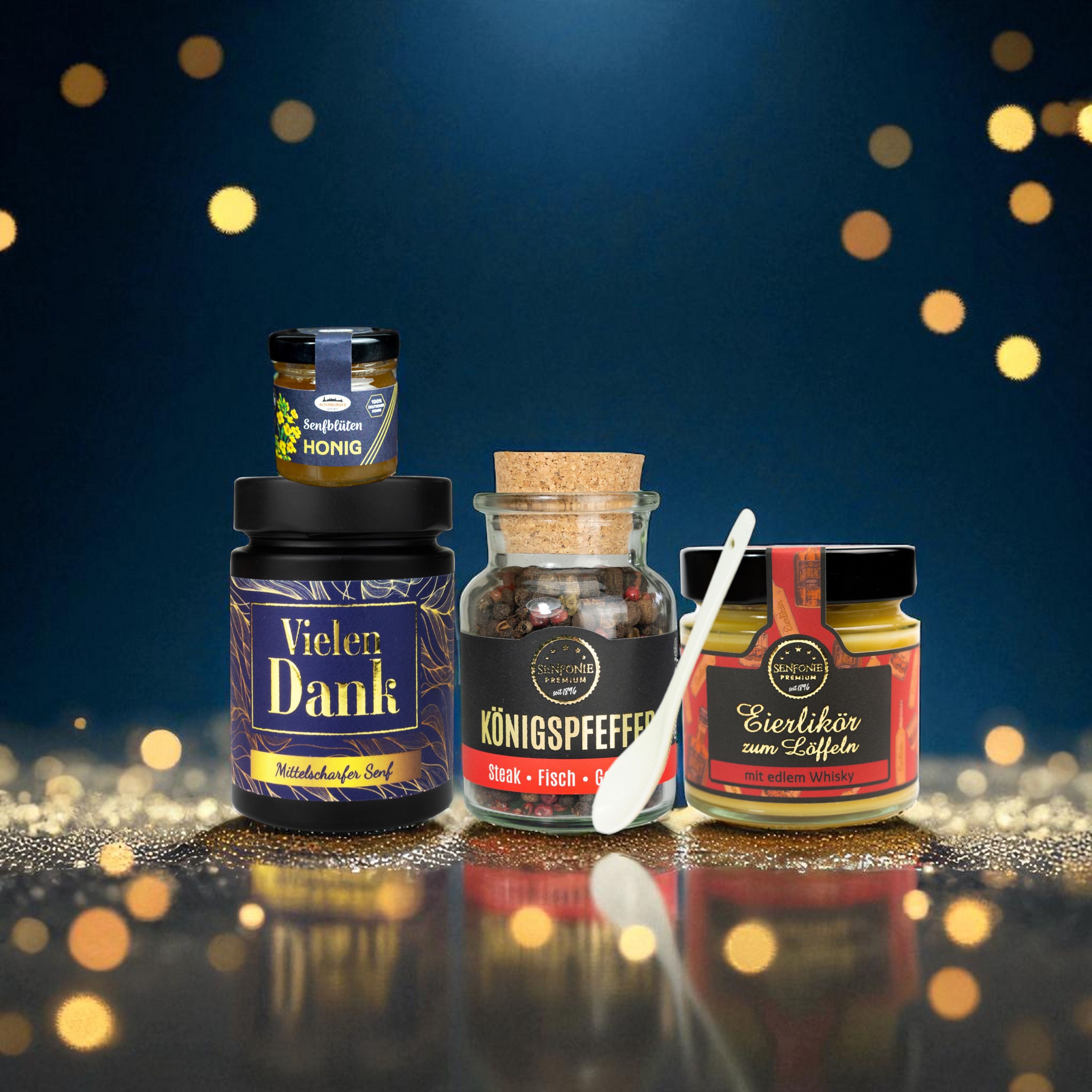 Entdecke die liebevoll zusammengestellte "Dankeschön" Box! Sie ist vollgepackt mit Köstlichkeiten und kleinen Überraschungen. Freu dich auf unseren unschlagbar leckeren "Vielen Dank Senf", einen unwiderstehlichen Eierlikör mit einem Schuss Whisky zum Löffeln und eine hochwertige Pfeffermischung. Abgerundet wird das Set mit einem eleganten Porzellanlöffel. Diese Box ist einfach perfekt, um deine Dankbarkeit auszudrücken und einem lieben Menschen ein Lächeln ins Gesicht zu zaubern!