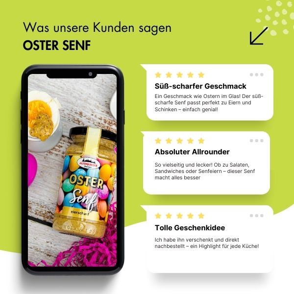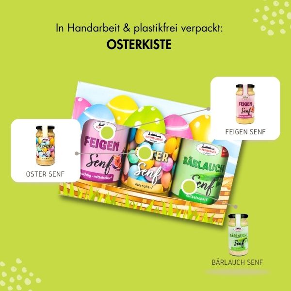 🌸 Ostersenf: Süß-scharfer Klassiker, exklusiv zur Osterzeit – ein herrlicher Begleiter zum Osterei und ein Highlight auf jedem Tisch.