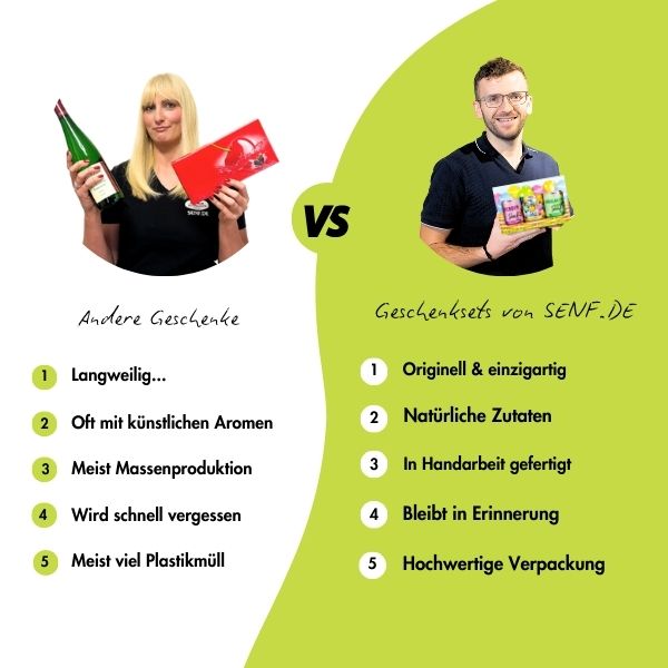 Du wolltest schon immer deinen Senf dazu geben? Als persönliche Geschenkidee zur Hochzeit, für die besonderen Kunden oder die Lieblingsmitarbeiter? Erprobe dich als Senf-Gourmet und höre ganz auf deinen Geschmackssinn, indem du deinen eigenen Senf kreierst. Veredelt wird deine Senf-Kreation mit einem individuellen Etikett – ganz nach deinen Vorstellungen setzen wir mit dir zusammen deine Ideen um. Natürlich kannst du neben dem eigenen Senf auch ein individuell zusammengestelltes Gewürz oder eine spezielle Sauce kreieren, die wir mit deinem Etikett produzieren. Schau einfach hier vorbei: Dein eigener Senf.