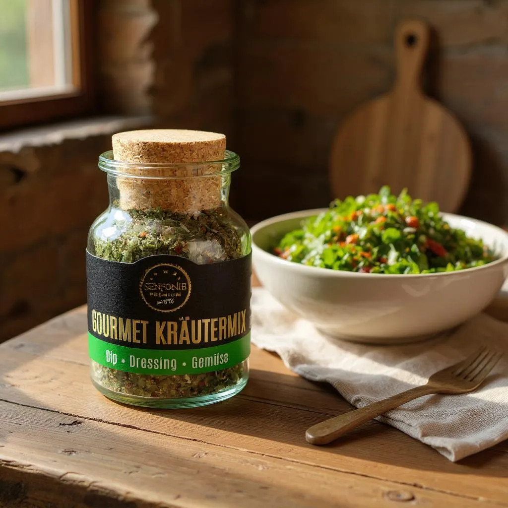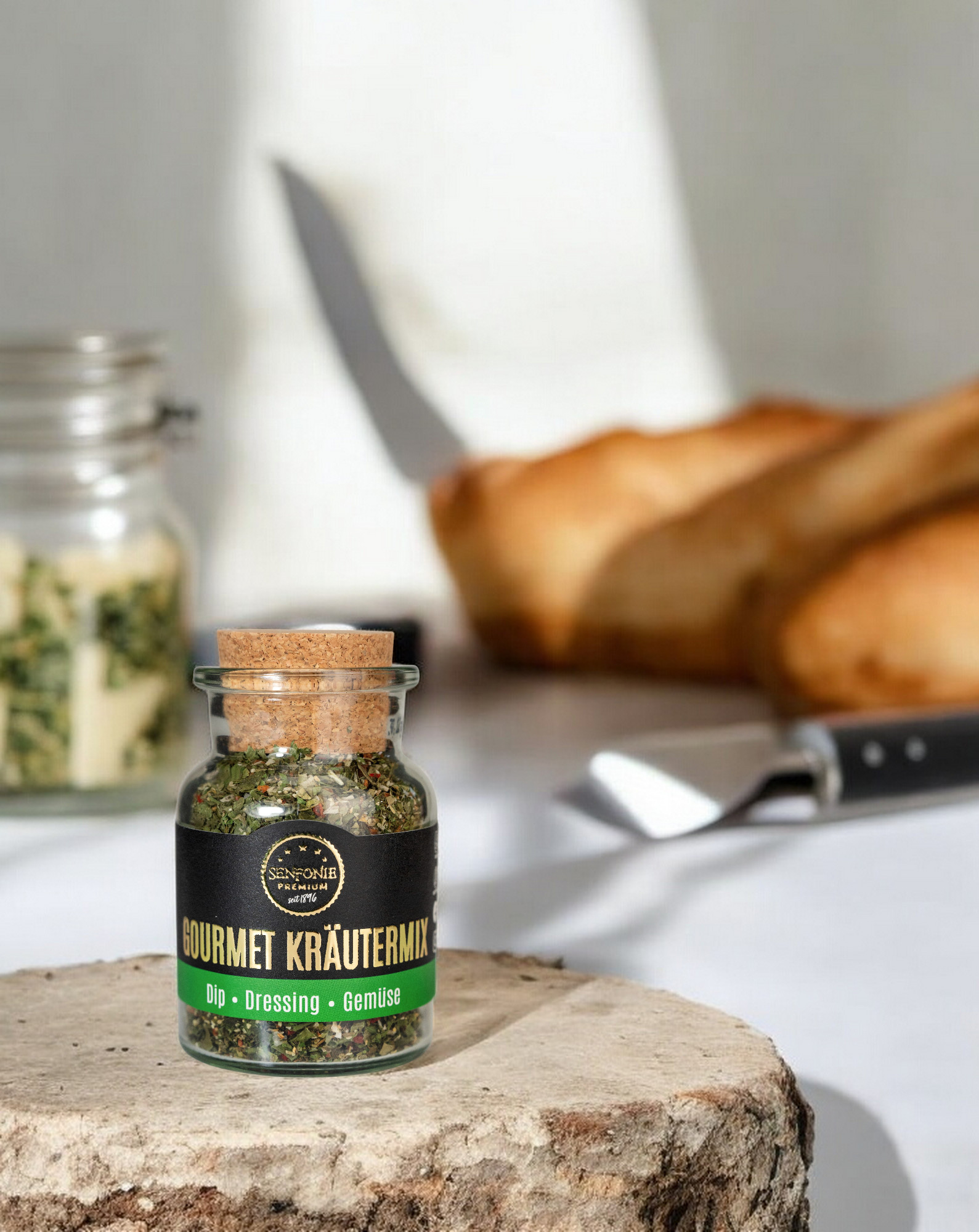 Entdecke die Welt feinster Kräuter direkt aus dem Garten! Unsere schonend getrockneten Kräuter, verfeinert mit Zwiebeln, Knoblauch und Paprika, bringen einen frischen, natürlichen Geschmack in deine Gerichte. Ideal geeignet zur Zubereitung von aromatischer Kräuterbutter oder zum Verfeinern von Frischkäse, Quark, Crème Fraîche oder Mayo. Dieser milde Begleiter passt perfekt zu heißen Ofenkartoffeln, würzigem gegrilltem Fleisch oder als Sauce zu knackigem Gemüse. Für einen leckeren Dip einfach 200 g Joghurt, 100 g Crème Fraîche, eine Prise Salz und 2-3 EL Gourmet Kräutermix vermengen und für 20 Minuten ziehen lassen. Genieße den unvergleichlichen Geschmack der Natur in jedem Bissen!