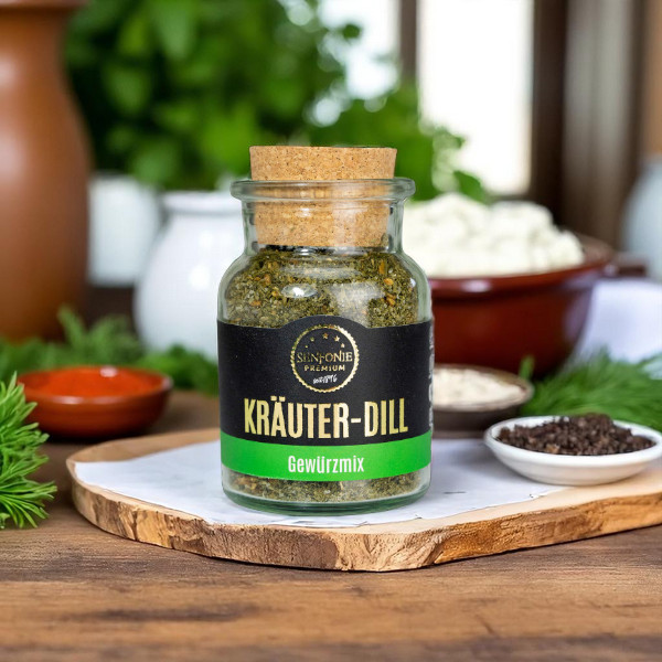 Dein Must-have für die mediterrane Küche! Ob cremige Remoulade, feiner Gurkensalat oder zarter Fisch – mit unserer Kräuter-Dill Gewürzzubereitung bringst du echtes Urlaubs-Feeling auf den Teller. Natürlich, intensiv und einfach unglaublich lecker. Unser Tipp: Zwei Gurken in feine Scheiben hobeln, mit 5 g Salz und 2 TL "Kräuter-Dill Gewürzzubereitung" würzen und 5 Minuten ziehen lassen. Den Salat mit 100 g Créme Fraîche, dem Saft einer halben Zitrone und 3 EL Olivenöl verfeinern.