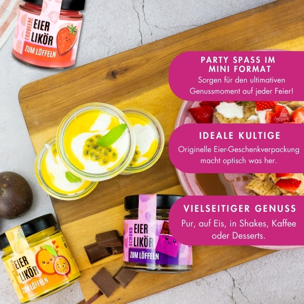 Erdbeer-Eierlikör: Die süße und saftige Frische von Erdbeeren vereint sich mit dem cremigen Eierlikör zu einem Geschmackserlebnis, das dich nicht mehr loslassen wird. Ideal für Liebhaber fruchtiger Aromen.