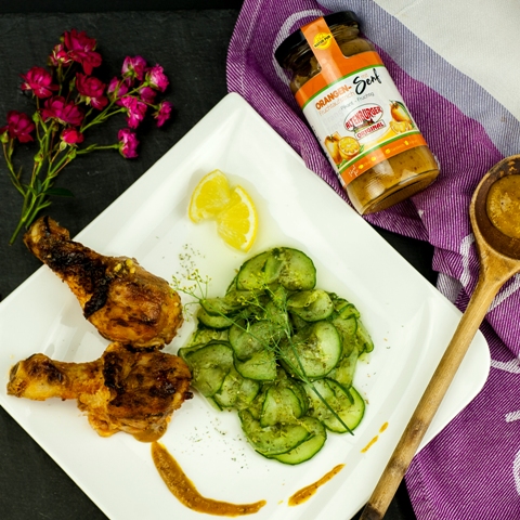 | Zutaten | 80 % Orangen Fruchtaufstrich (Orangenpüree, Zucker, Säuerungsmittel: Citronensäure, Geliermittel: Pektin), 20 % Senf (natürliches Mineralwasser, Senfschrot, Branntweinessig, Kalahari Salz, Zucker) |