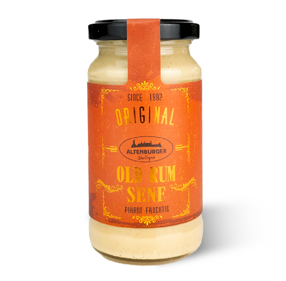 Im Altenburger Rum Senf verschmelzen mittelscharfer Senf, würziges Bratapfel-Chutney und wärmender Rum zu einem vollen, runden und perfekten Ganzen. Eine charakteristische Bratapfelsüße wird gefolgt von Zimt und Anklängen von Ingwer sowie die leichte Senf-Schärfe. 5 % von im Holzfass-gereiftem Rum sorgen für das besondere Finish. So wird der Old Rum Senf zu einem schmackhaften Begleiter zu Wild- und Bratengerichten.