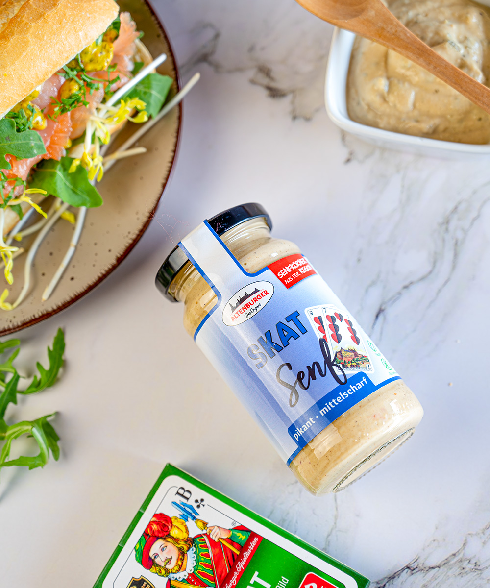Exklusiv aus dem Altenburger Senfladen stammt unser Skat Senf, der die lange Tradition und Geschichte unserer schönen Stadt widerspiegelt. Seit dem Aufkommen des Skatspiels im Jahr 1820 sind die Altenburger bekannt für ihre Liebe zum Senf und ihre kulinarischen Genüsse. Unser Skat Senf besticht durch eine einzigartige Kombination aus traditionell hergestelltem Senf und einer feinen, fruchtigen Note aus sonnengereiften Tomaten. Er verleiht nicht nur Bratwürsten eine besondere Note, sondern eignet sich auch hervorragend als Dip für Brezeln, zur Verfeinerung von Saucen oder als würzige Komponente in Sandwiches und Burgern. Mit dem Skat Senf habt ihr alle Trümpfe in der Hand und könnt eure kulinarischen Kreationen auf ein neues Level heben.