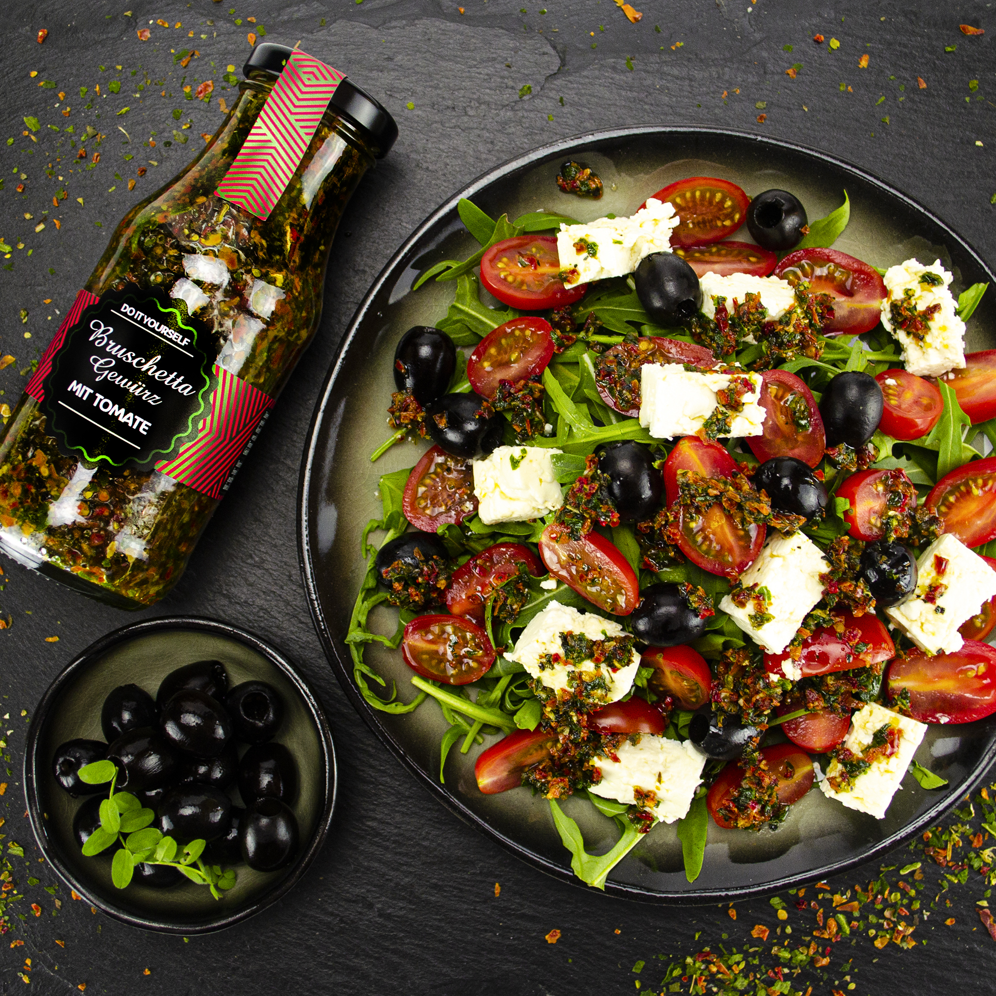Die Do it yourself-Bruschetta Flasche mit etwas Wasser füllen, damit die Gewürze bedeckt sind und quellen können; anschließend mit Olivenöl auffüllen. Die Flasche verschließen und kräftig schütteln. Für ein paar Minuten ziehen lassen.