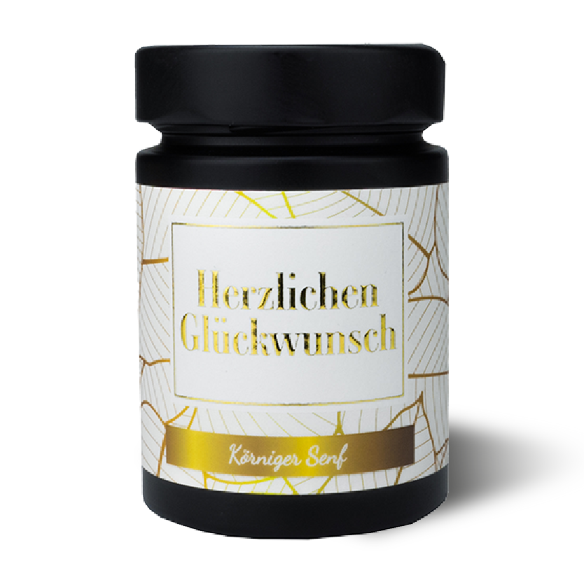 Stell dir vor, du könntest deinen Glückwunsch in Form eines außergewöhnlichen Senfs überreichen – das ist unser hochwertiger "Herzlichen Glückwunsch" Senf! Dieser Senf ist nicht nur ein Gewürz, sondern eine köstliche Art, jemandem zu zeigen, wie besonders er oder sie ist. Der hochwertige "Herzlichen Glückwunsch" Senf enthält überraschend knackige Senfkörner, die bei jedem Bissen ein unvergleichliches Geschmackserlebnis bieten. Die milde Schärfe des Senfs verleiht den Gerichten eine angenehme Würze, ohne dabei zu überwältigen.