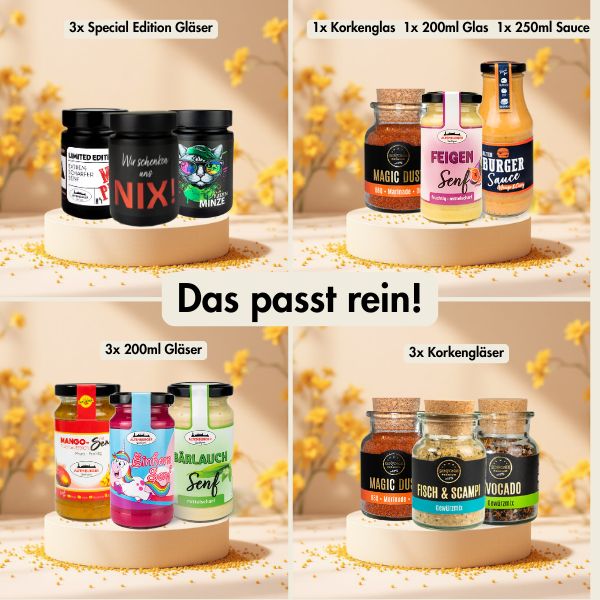 🎁 Vollgepackt mit Überraschungen: Mit zwei Mini-Gläsern aus unserem Sortiment und einer Postkarte für deine persönliche Botschaft.