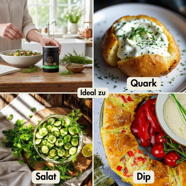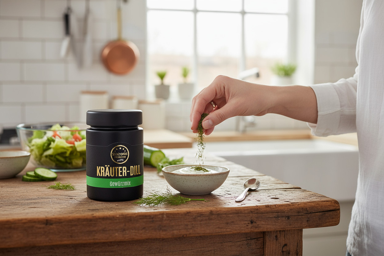 Dein Must-have für die mediterrane Küche! Ob cremige Remoulade, feiner Gurkensalat oder zarter Fisch – mit unserer Kräuter-Dill Gewürzzubereitung bringst du echtes Urlaubs-Feeling auf den Teller. Natürlich, intensiv und einfach unglaublich lecker. Unser Tipp: Zwei Gurken in feine Scheiben hobeln, mit 5 g Salz und 2 TL "Kräuter-Dill Gewürzzubereitung" würzen und 5 Minuten ziehen lassen. Den Salat mit 100 g Créme Fraîche, dem Saft einer halben Zitrone und 3 EL Olivenöl verfeinern.