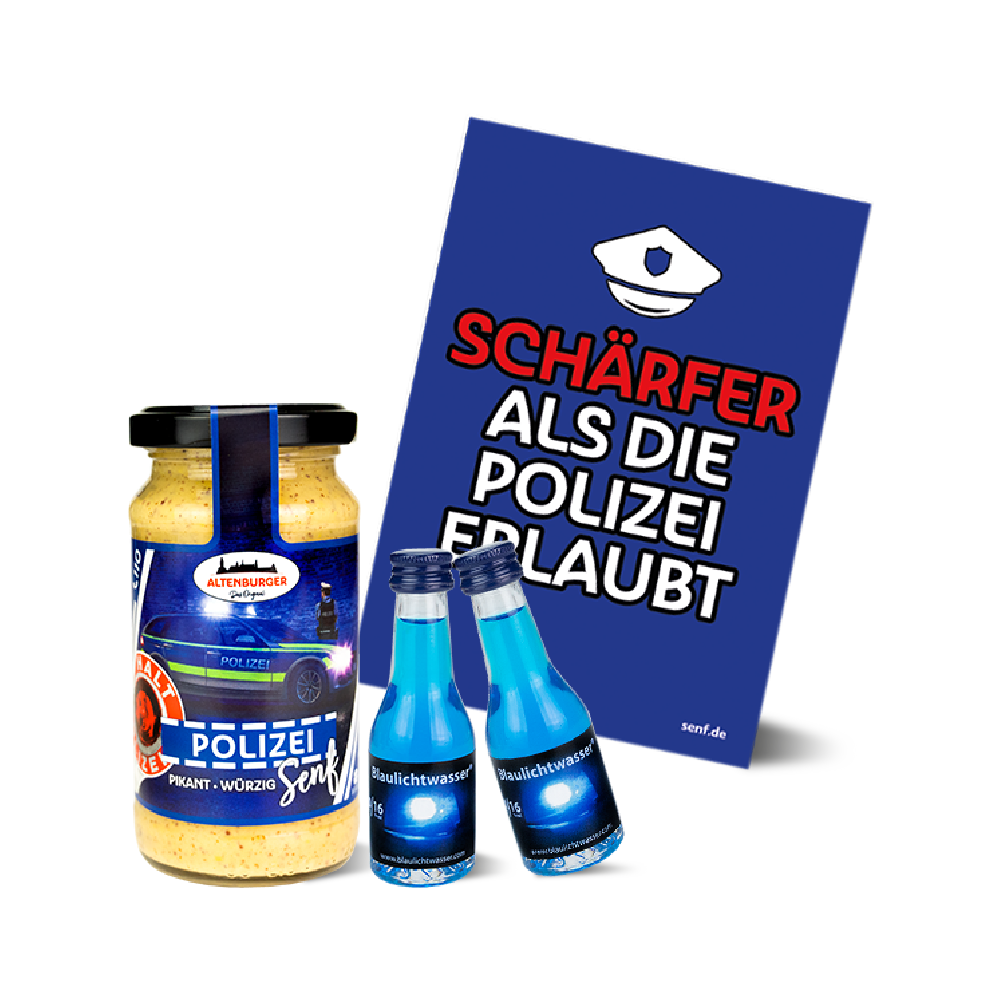 Tauche ein in den kernigen Geschmack unseres Polizei Senfs, der perfekt durch den originellen Blaulichtwasser® Likör ergänzt wird. Dieses Duo sorgt garantiert für Aufsehen und bringt Stimmung in jede Runde.