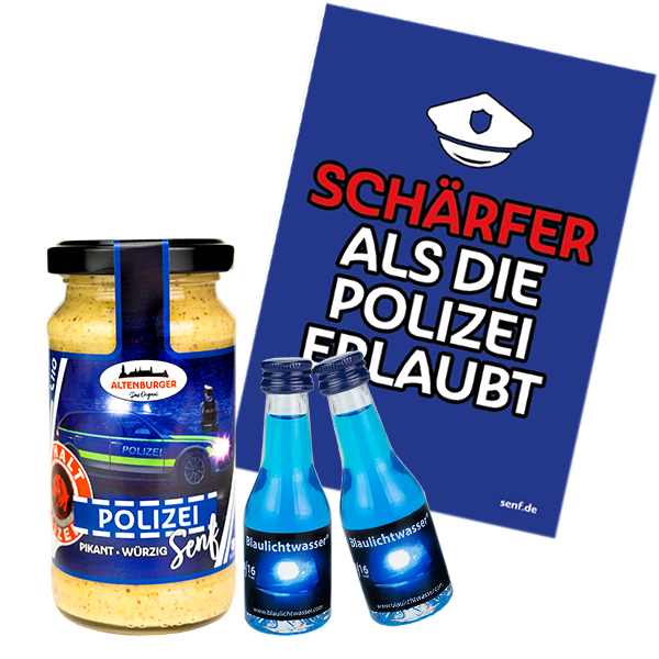 Tauche ein in den kernigen Geschmack unseres Polizei Senfs, der perfekt durch den originellen Blaulichtwasser® Likör ergänzt wird. Dieses Duo sorgt garantiert für Aufsehen und bringt Stimmung in jede Runde.