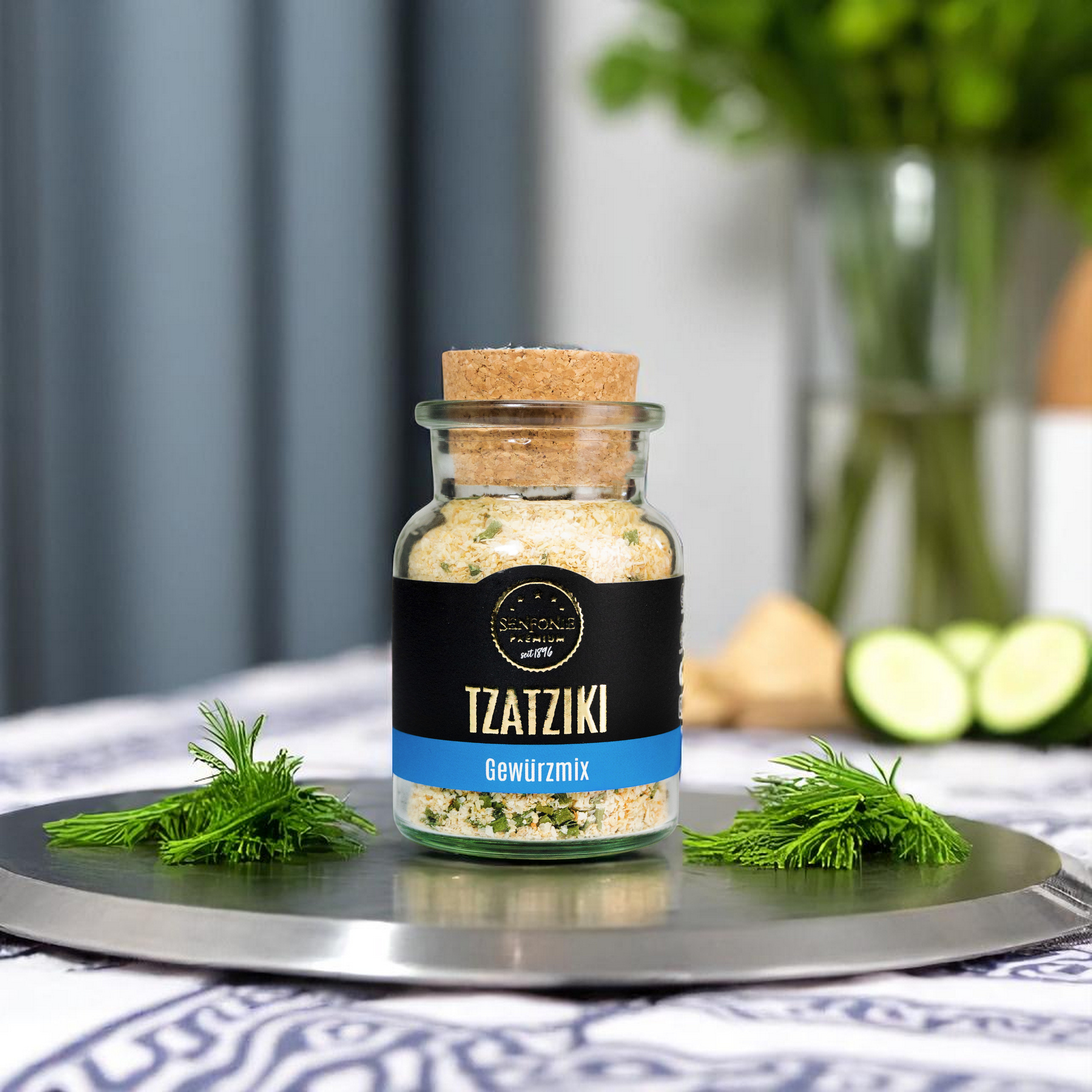 200 g Schmand und 100 g Joghurt vermengen und mit dem Tzatziki-Gewürz verrühren. Schnittlauch klein-hacken und unter den Dip rühren.