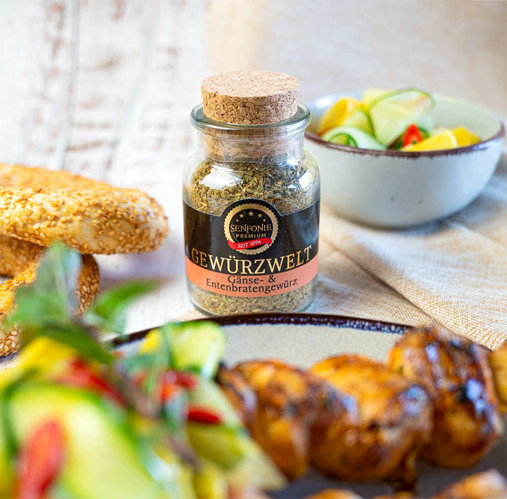 Die ausgewaschene, getrocknete Ente mit Gänse- & Entenbratengewürz würzen.