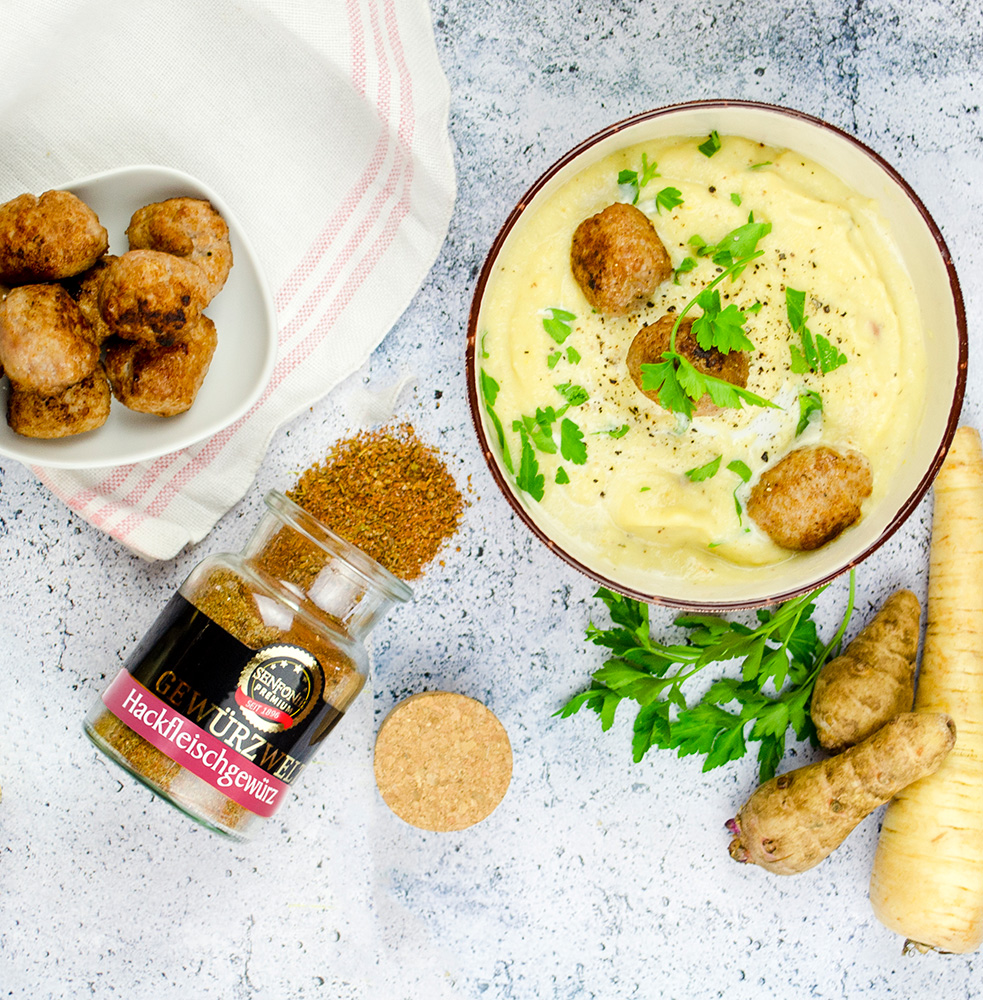 Das Hackfleischgewürz und das Rühreigewürz mit Senföl mischen und auf das Fleisch auftragen. Die Lammkeule mit Salz und Pfeffer würzen.
