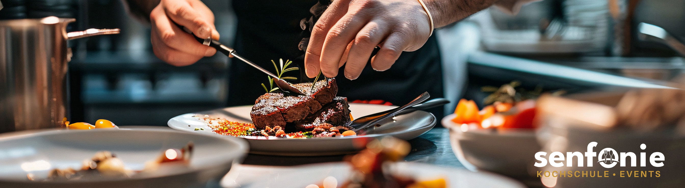Du kochst gemeinsam mit unserem Küchenmeister ein hochwertiges 3- oder 4-Gänge-Menü. Ob Mediterrane Genussreise, Steaks & Saucen, Kulinarische Weltreise, Wildes aus dem Wald oder Bella Italia – bei uns erlebst du die Vielfalt der Kochkunst hautnah. Ausgestattet mit deiner eigenen Kochschürze, einem erstklassigen Wein oder Bier und bester Laune, verbringst du unvergessliche Stunden in unserer Kochschule. Hier lernst du nicht nur Tipps & Tricks beim Kochen kennen, sondern auch interessante Menschen, die deine Leidenschaft teilen. Das Beste daran? Du musst kein Kochprofi sein!