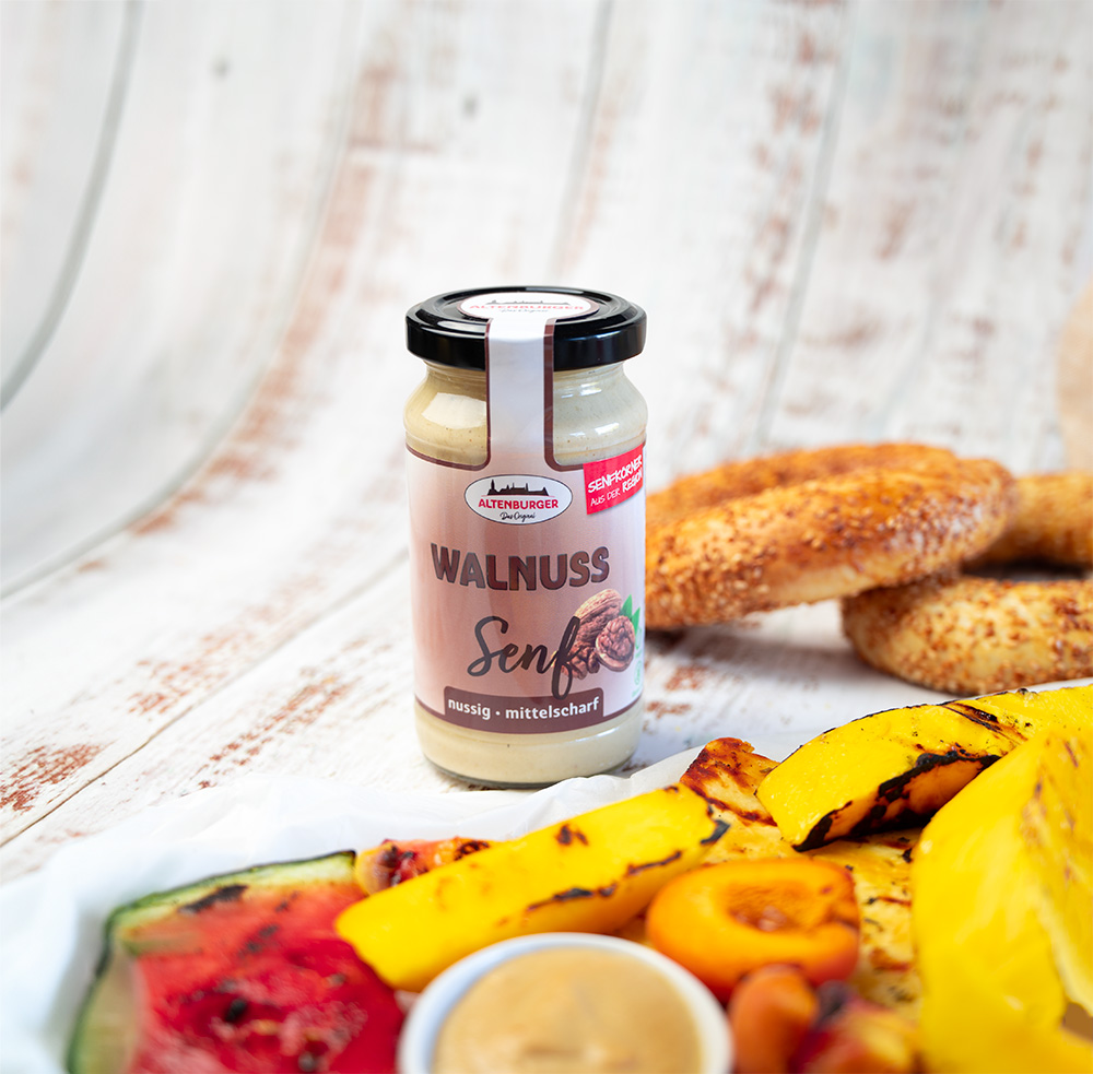 Genieße den milden Geschmack unseres Walnuss Senfs, der mit einer leichten Bitternote und dem intensiven Aroma der herbsüßen Baumfrucht verzaubert. Dieser mittelscharfe Senf ist die perfekte Ergänzung für eine Vielzahl von Gerichten und lässt deine Geschmacksknospen tanzen. Ob zum Schinkenbrot, zur Verfeinerung von Salat- und Bratensaucen oder als Dip für Gemüse, Brot und Käse – unser Walnuss Senf ist ein Alleskönner in der Küche und verleiht jedem Gericht eine besondere Note. Dank der schonenden Verarbeitung und der hochwertigen Zutaten schmeckt unser Walnuss Senf intensiv nach der herbsüßen Baumfrucht und sorgt für ein unvergleichliches Geschmackserlebnis. Entdecke den intensiven Genuss unseres Walnuss Senfs und verleihe deinen Lieblingsgerichten eine besondere Note!