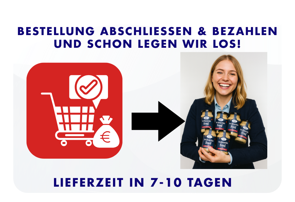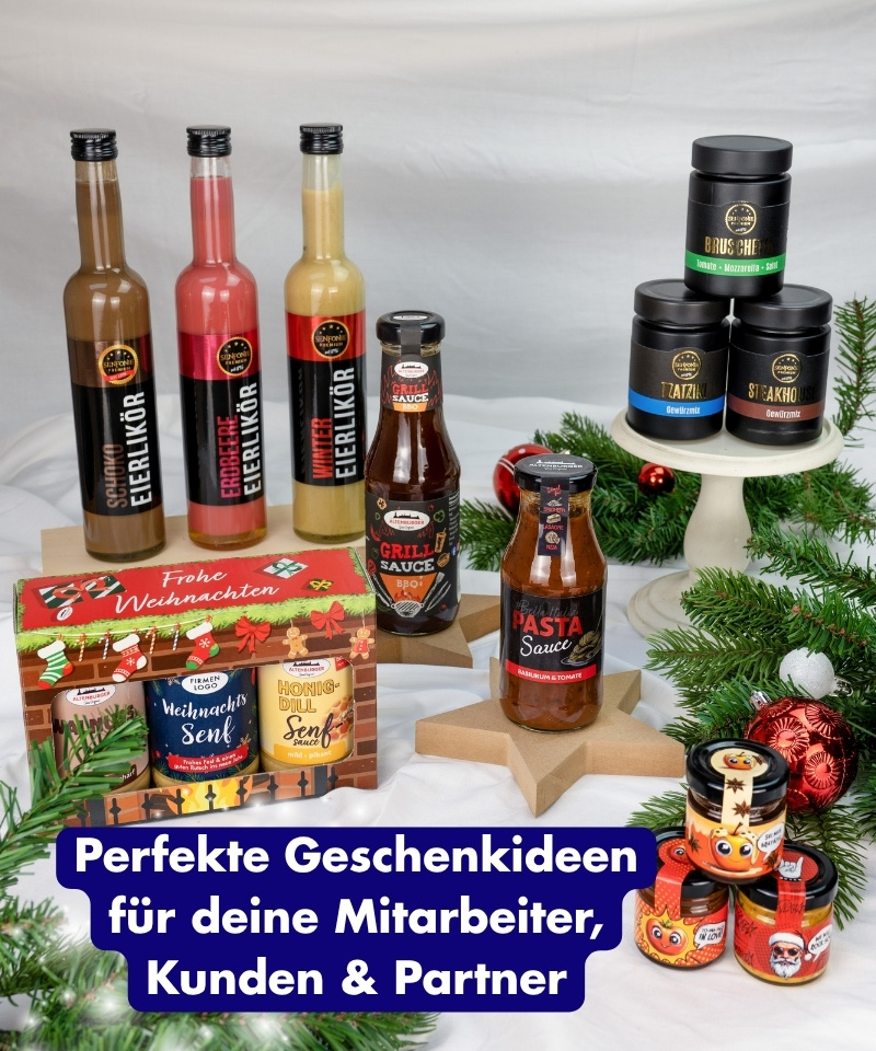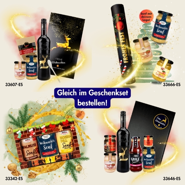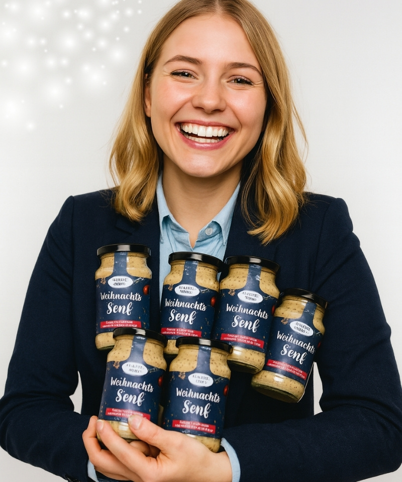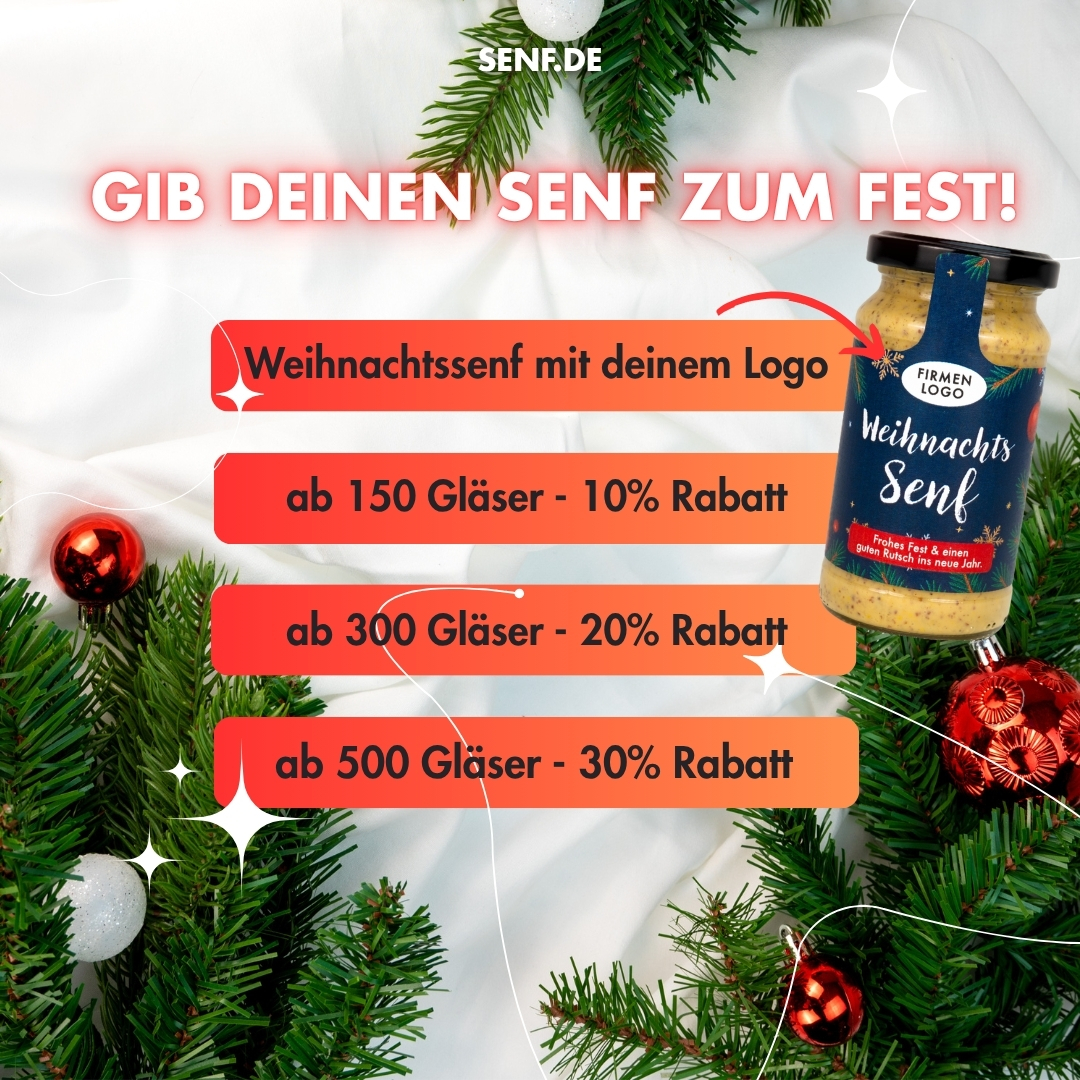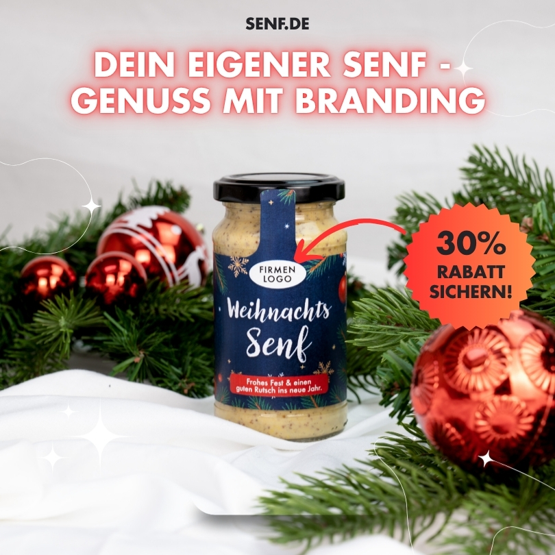 Unser süß-scharfer Weihnachtssenf ist der handgemachte Klassiker zur Festzeit – ab sofort mit deinem eigenen Logo. Ideal als nachhaltiges, regionales und wertiges Geschenk für Mitarbeitende, Kund:innen oder Partner. Natürlich im Glas statt Plastik, mit hochwertigen Zutaten und echter Manufakturqualität aus Thüringen.