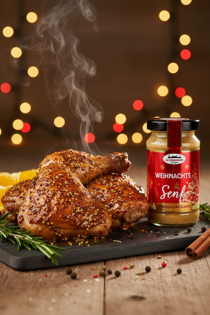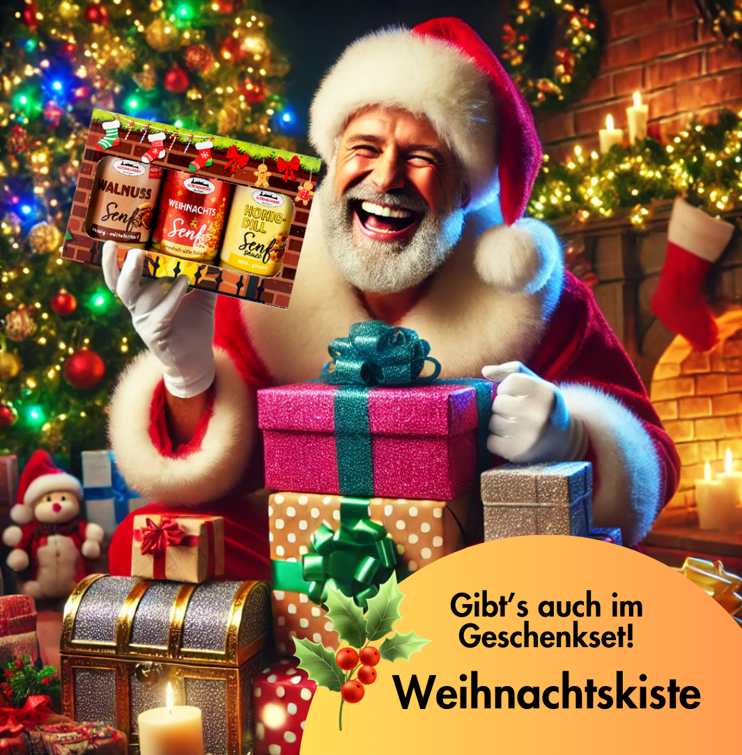 Der süß-scharfe Weihnachtssenf ist kein gewöhnlicher Senf – er ist die festliche Geschmacksexplosion, auf die du das ganze Jahr gewartet hast! Mit seiner einzigartigen Kombination aus weihnachtlicher Süße und feurigem Scharf sorgt er für Freude auf dem Teller und Hitze unterm Mistelzweig. Ideal als Geheimzutat für deine Festtagsküche oder als Geschenk für Senf-Liebhaber, die es besonders würzig mögen. Aber Achtung: Dieses würzige Goldstück gibt es nur einmal im Jahr – greif zu, bevor es der Weihnachtsmann wegschleckt!
